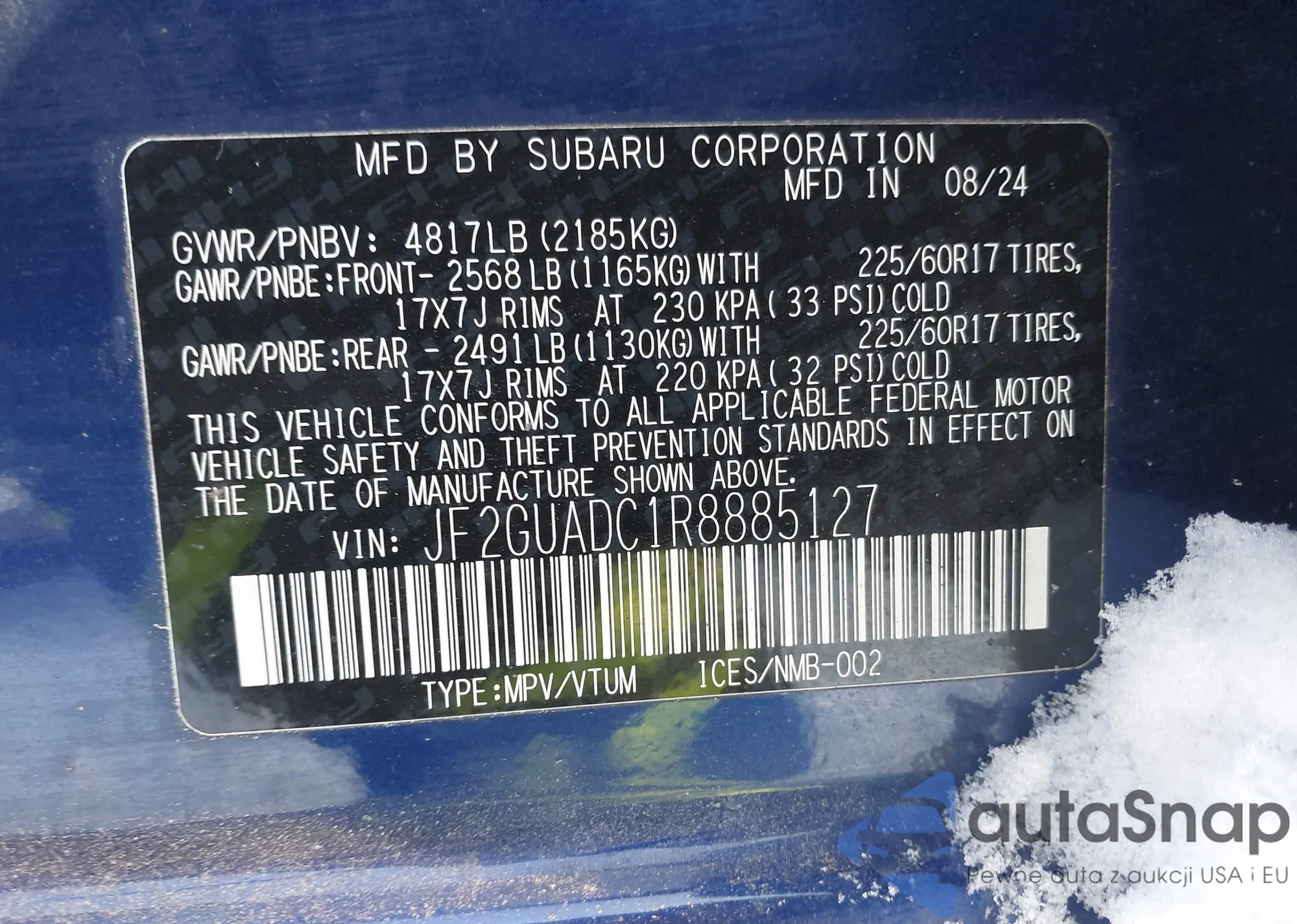 Samochód Subaru XV 2024 (VIN JF2GUADC1R8885127) nie był wcześniej licytowany. Dokumenty są czyste, przebieg odpowiada lub jest niższy niż średnia rynku. Sprzedaje go firma ubezpieczeniowa – polecamy zakup. Dostawa do portu zajmie ok. 6–8 tygodni.