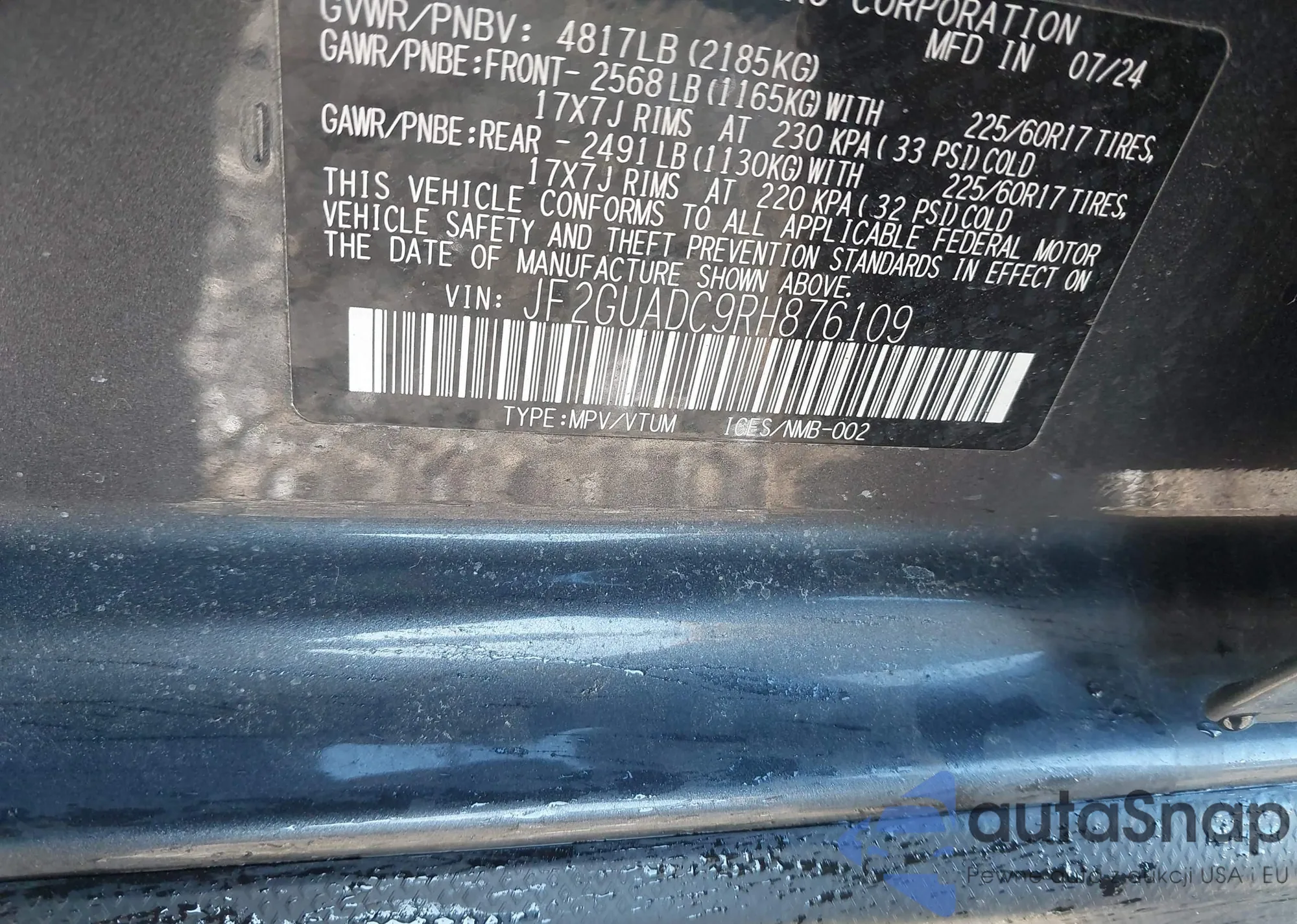 Samochód Subaru XV 2024 (VIN JF2GUADC9RH876109) nie był wcześniej licytowany. Dokumenty są czyste, przebieg odpowiada lub jest niższy niż średnia rynku. Sprzedaje go firma ubezpieczeniowa – polecamy zakup. Dostawa do portu zajmie ok. 6–8 tygodni.