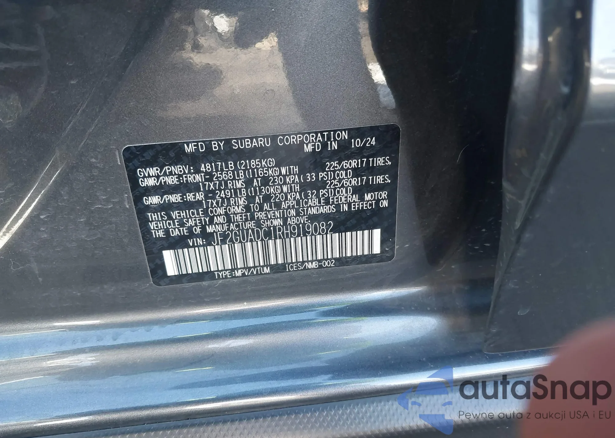 Samochód Subaru XV 2024 (VIN JF2GUADC1RH919082) nie był wcześniej licytowany. Dokumenty są czyste, przebieg odpowiada lub jest niższy niż średnia rynku. Sprzedaje go firma ubezpieczeniowa – polecamy zakup. Dostawa do portu zajmie ok. 6–8 tygodni.
