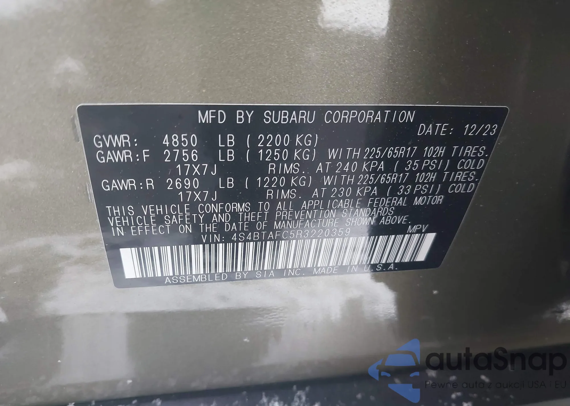 Samochód Subaru Outback 2024 (VIN 4S4BTAFC5R3220359) nie był wcześniej licytowany. Dokumenty są czyste, przebieg odpowiada lub jest niższy niż średnia rynku. Sprzedaje go firma ubezpieczeniowa – polecamy zakup. Dostawa do portu zajmie ok. 6–8 tygodni.