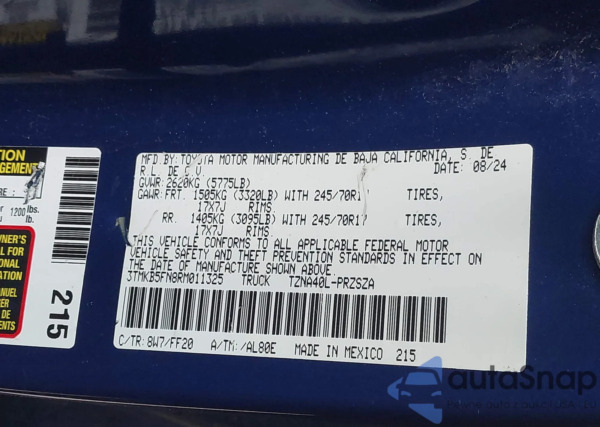 Samochód Toyota Tacoma 2024 (VIN 3TMKB5FN8RM011325) nie był wcześniej licytowany. Dokumenty są czyste, przebieg odpowiada lub jest niższy niż średnia rynku. Sprzedaje go firma ubezpieczeniowa – polecamy zakup. Dostawa do portu zajmie ok. 6–8 tygodni.
