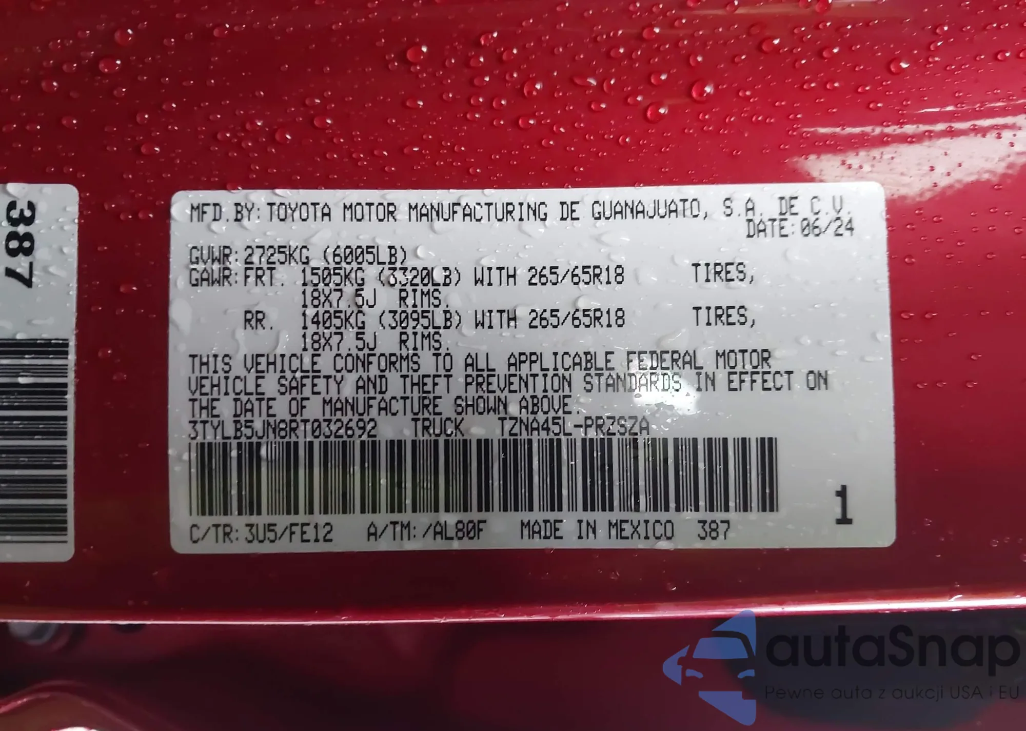 Samochód Toyota Tacoma 2024 (VIN 3TYLB5JN8RT032692) nie był wcześniej licytowany. Dokumenty są czyste, przebieg odpowiada lub jest niższy niż średnia rynku. Sprzedaje go firma ubezpieczeniowa – polecamy zakup. Dostawa do portu zajmie ok. 6–8 tygodni.
