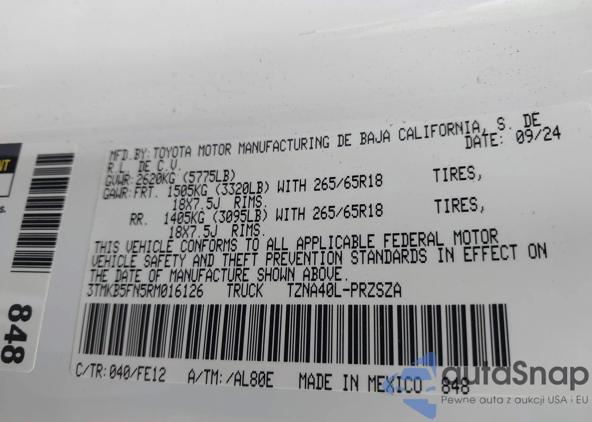 Samochód Toyota Tacoma 2024 (VIN 3TMKB5FN5RM016126) nie był wcześniej licytowany. Dokumenty są czyste, przebieg odpowiada lub jest niższy niż średnia rynku. Sprzedaje go firma ubezpieczeniowa – polecamy zakup. Dostawa do portu zajmie ok. 6–8 tygodni.