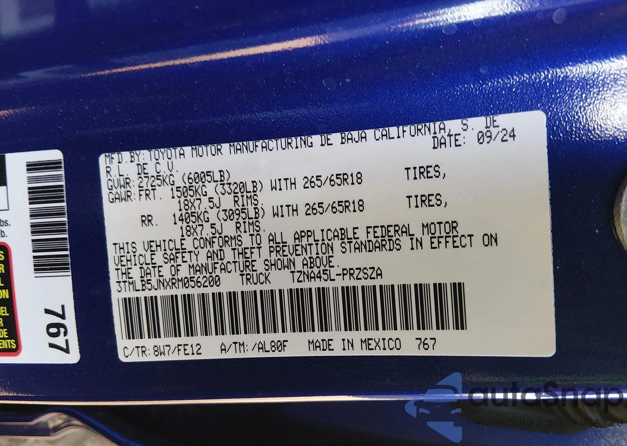 Samochód Toyota Tacoma 2024 (VIN 3TMLB5JNXRM056200) nie był wcześniej licytowany. Dokumenty są czyste, przebieg odpowiada lub jest niższy niż średnia rynku. Sprzedaje go firma ubezpieczeniowa – polecamy zakup. Dostawa do portu zajmie ok. 6–8 tygodni.