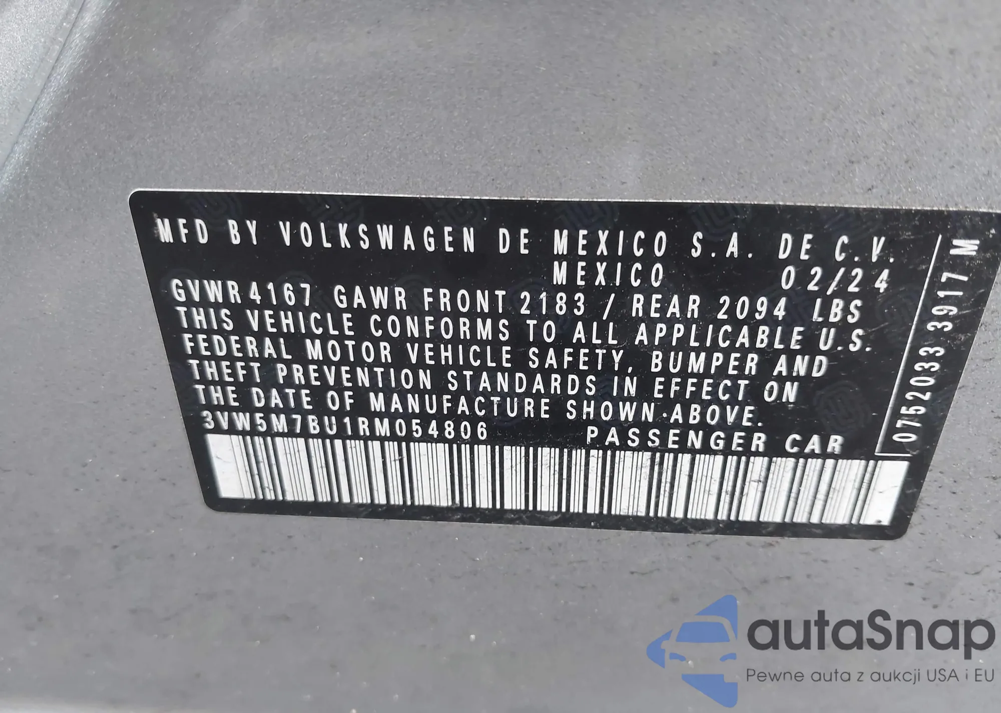 VIN: 3VW5M7BU1RM054806