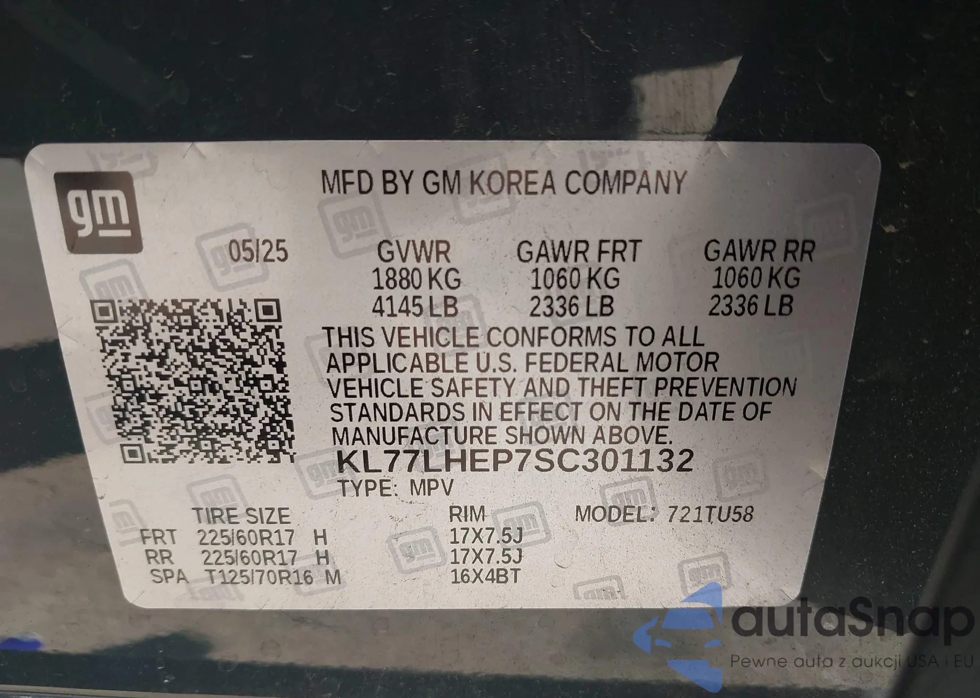 Samochód Chevrolet Trax 2025 (VIN KL77LHEP7SC301132) nie był wcześniej licytowany. Dokumenty są czyste, przebieg odpowiada lub jest niższy niż średnia rynku. Sprzedaje go firma ubezpieczeniowa – polecamy zakup. Dostawa do portu zajmie ok. 6–8 tygodni.