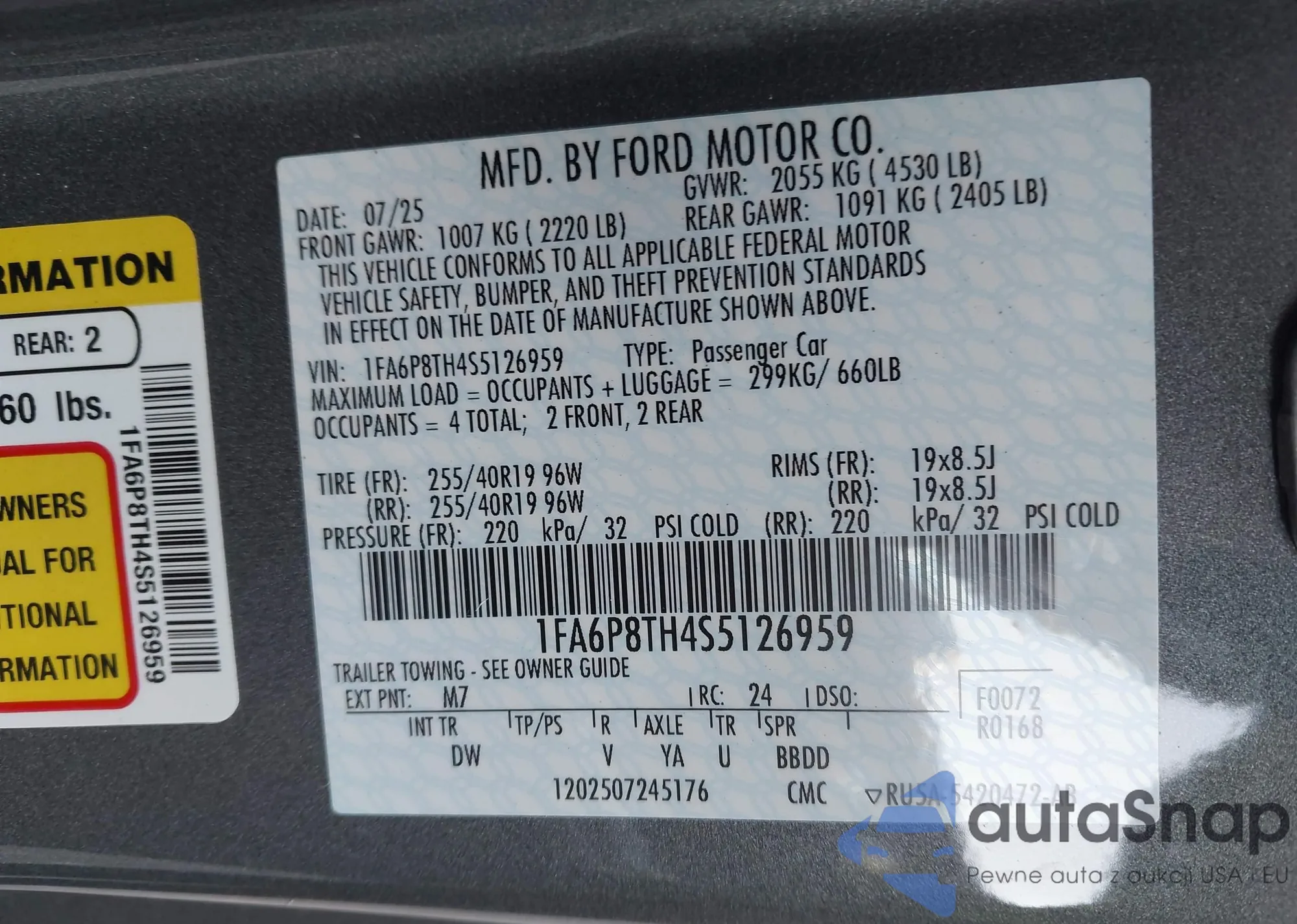 Samochód Ford Mustang 2025 (VIN 1FA6P8TH4S5126959) ma dokumenty uniemożliwiające rejestrację. Mogą pojawić się trudności przy eksporcie i rejestracji. Skontaktuj się z ekspertami AutaSnap w celu znalezienia alternatywy.