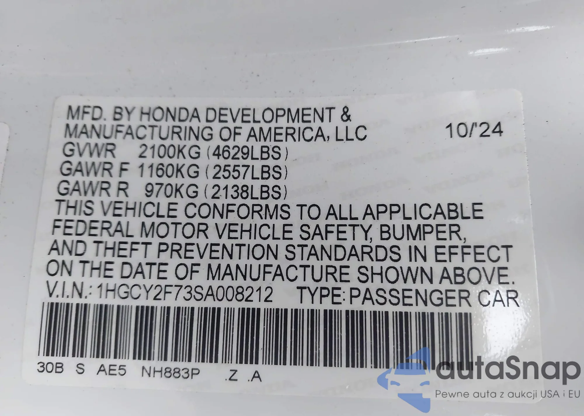 VIN: 1HGCY2F73SA008212