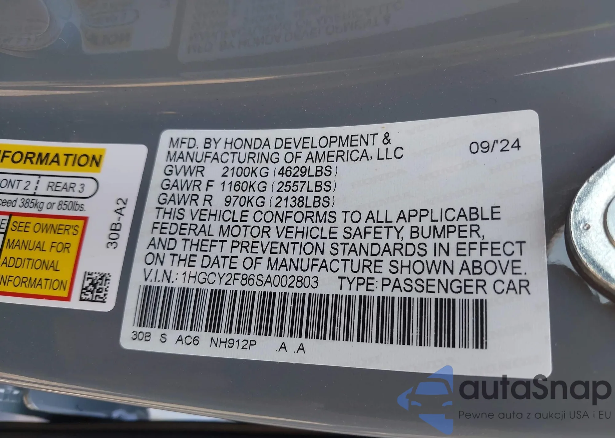 VIN: 1HGCY2F86SA002803