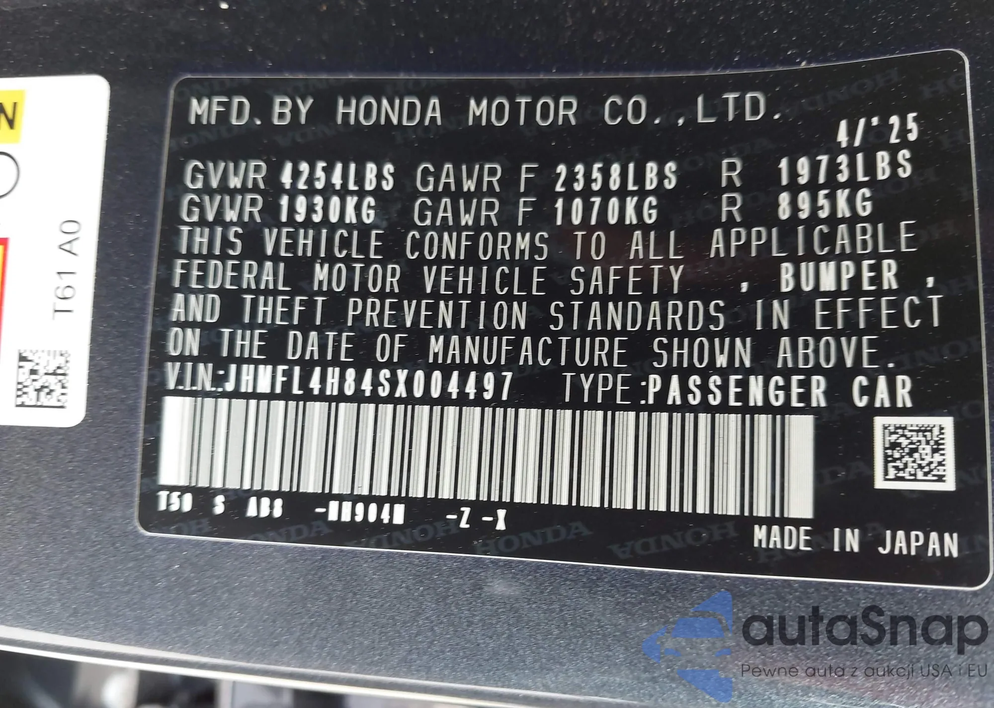 VIN: JHMFL4H84SX004497