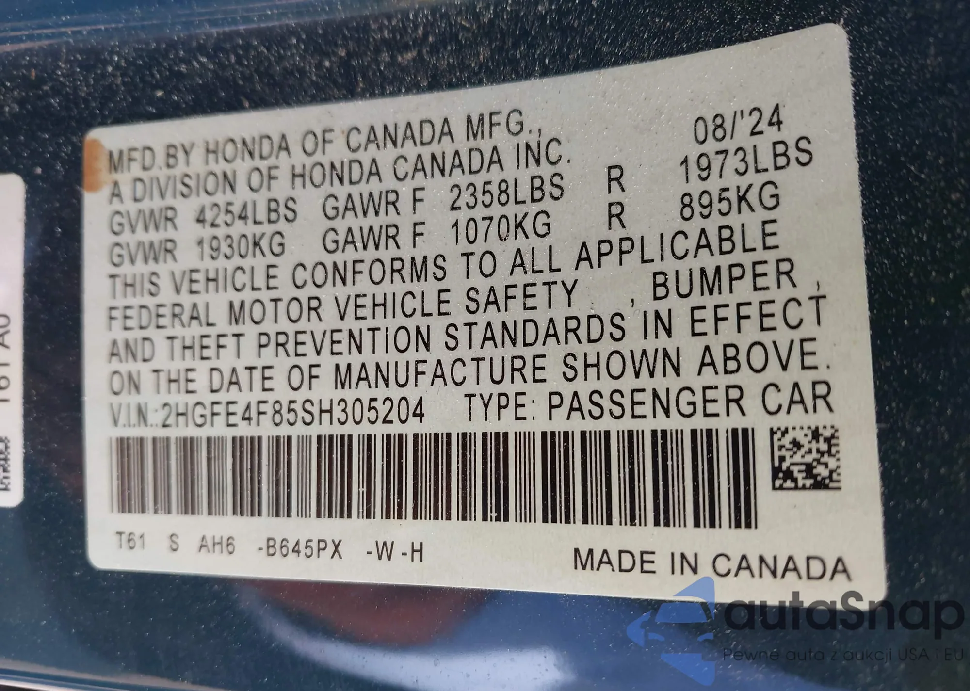 VIN: 2HGFE4F85SH305204
