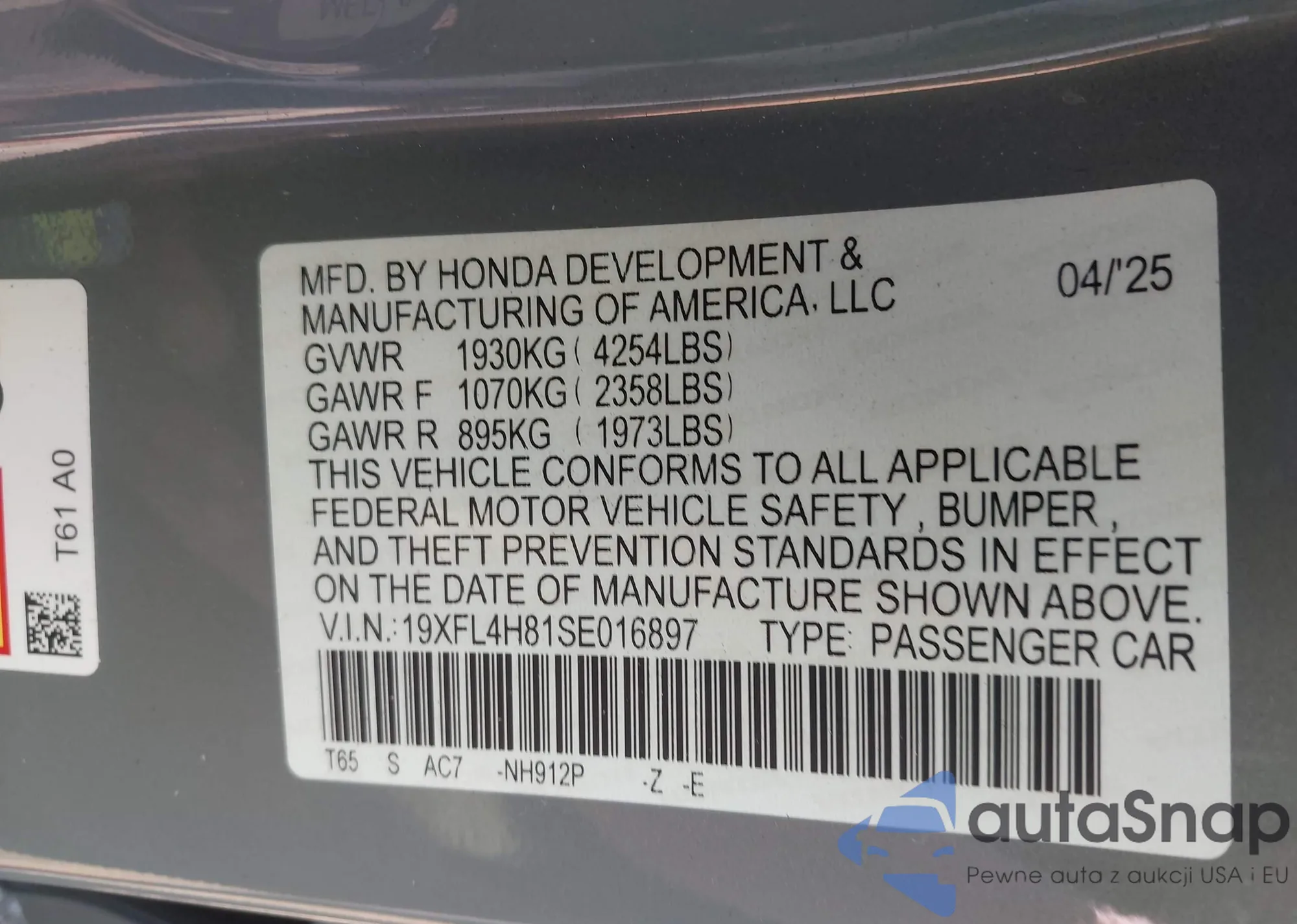 VIN: 19XFL4H81SE016897