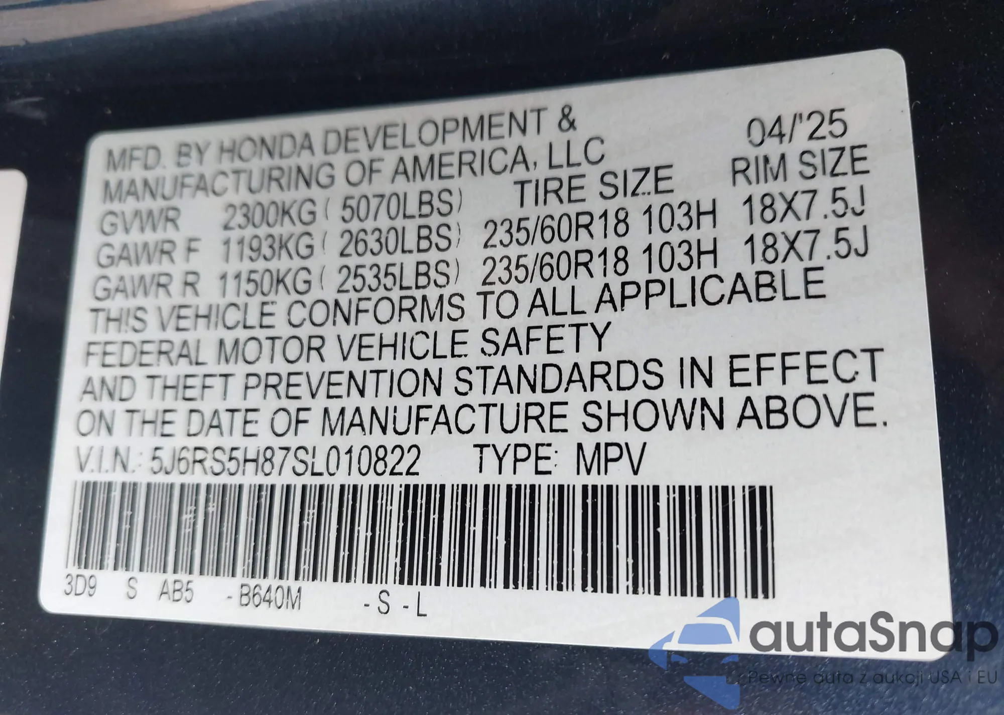 VIN: 5J6RS5H87SL010822