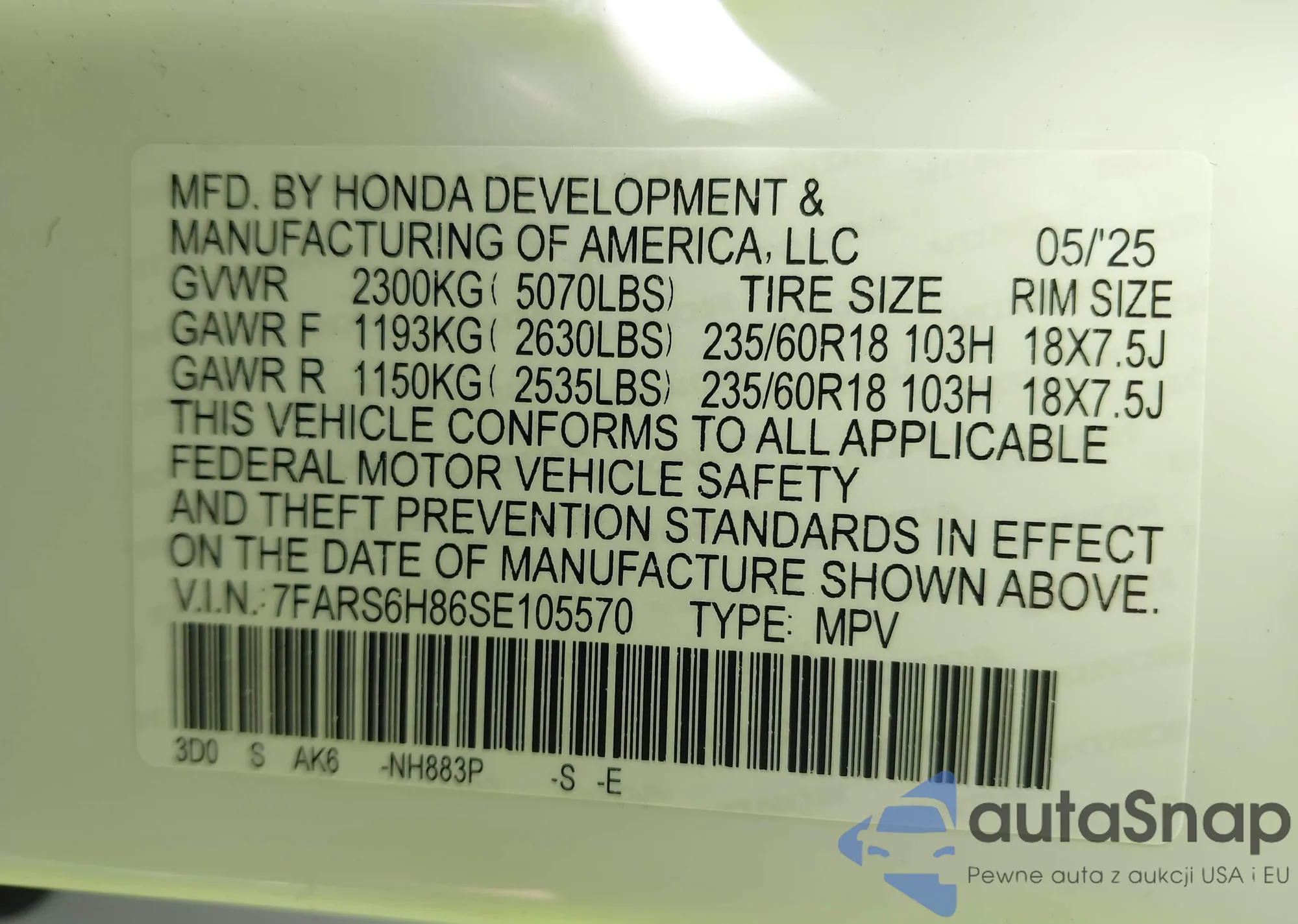 VIN: 7FARS6H86SE105570