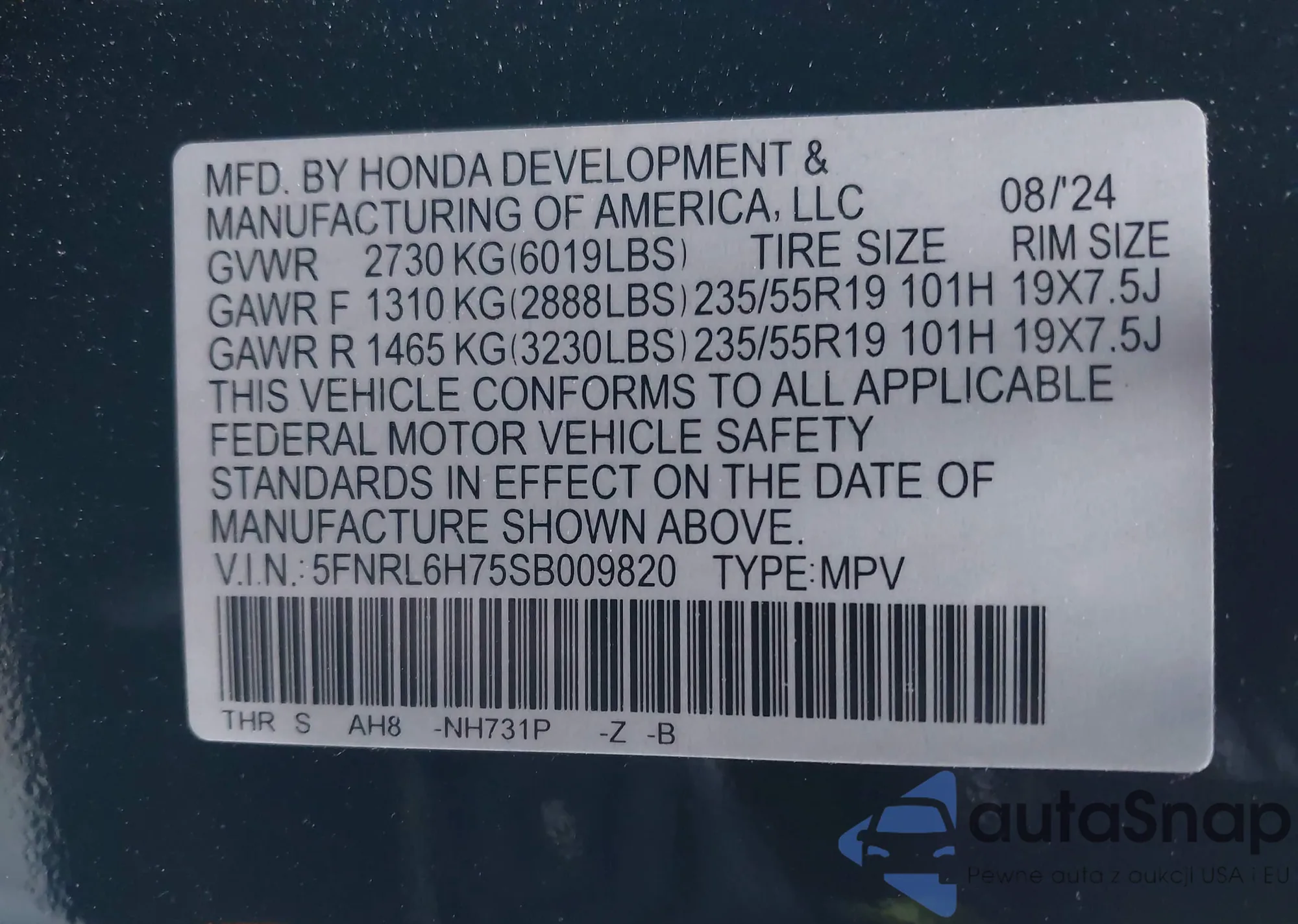• VIN: 5FNRL6H75SB009820