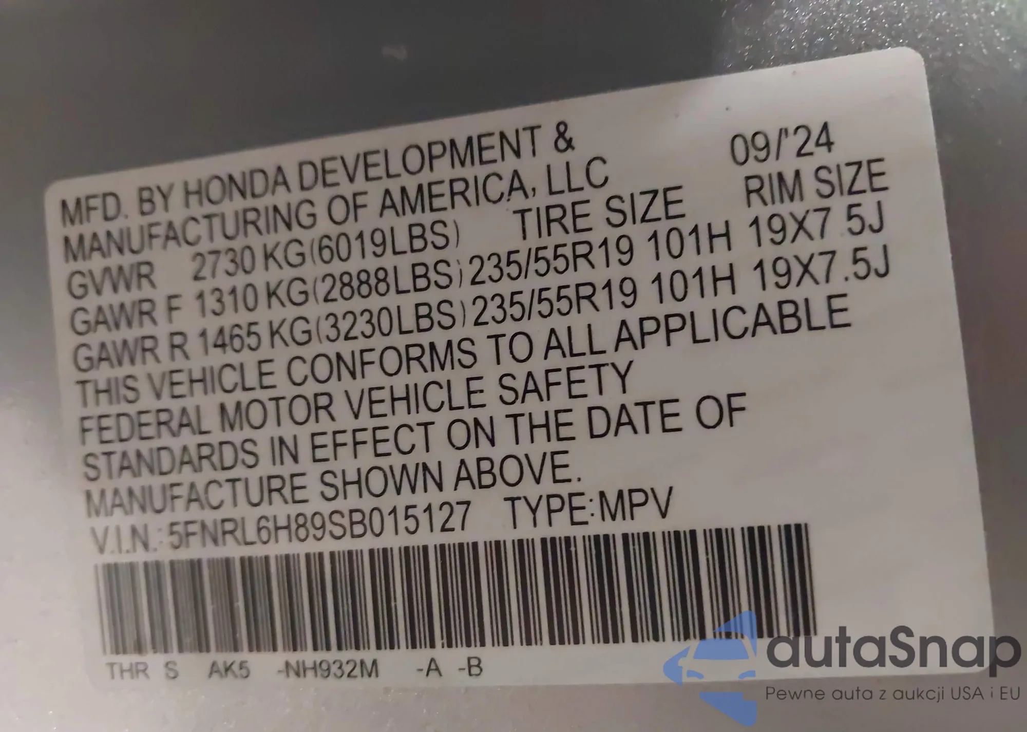 VIN: 5FNRL6H89SB015127