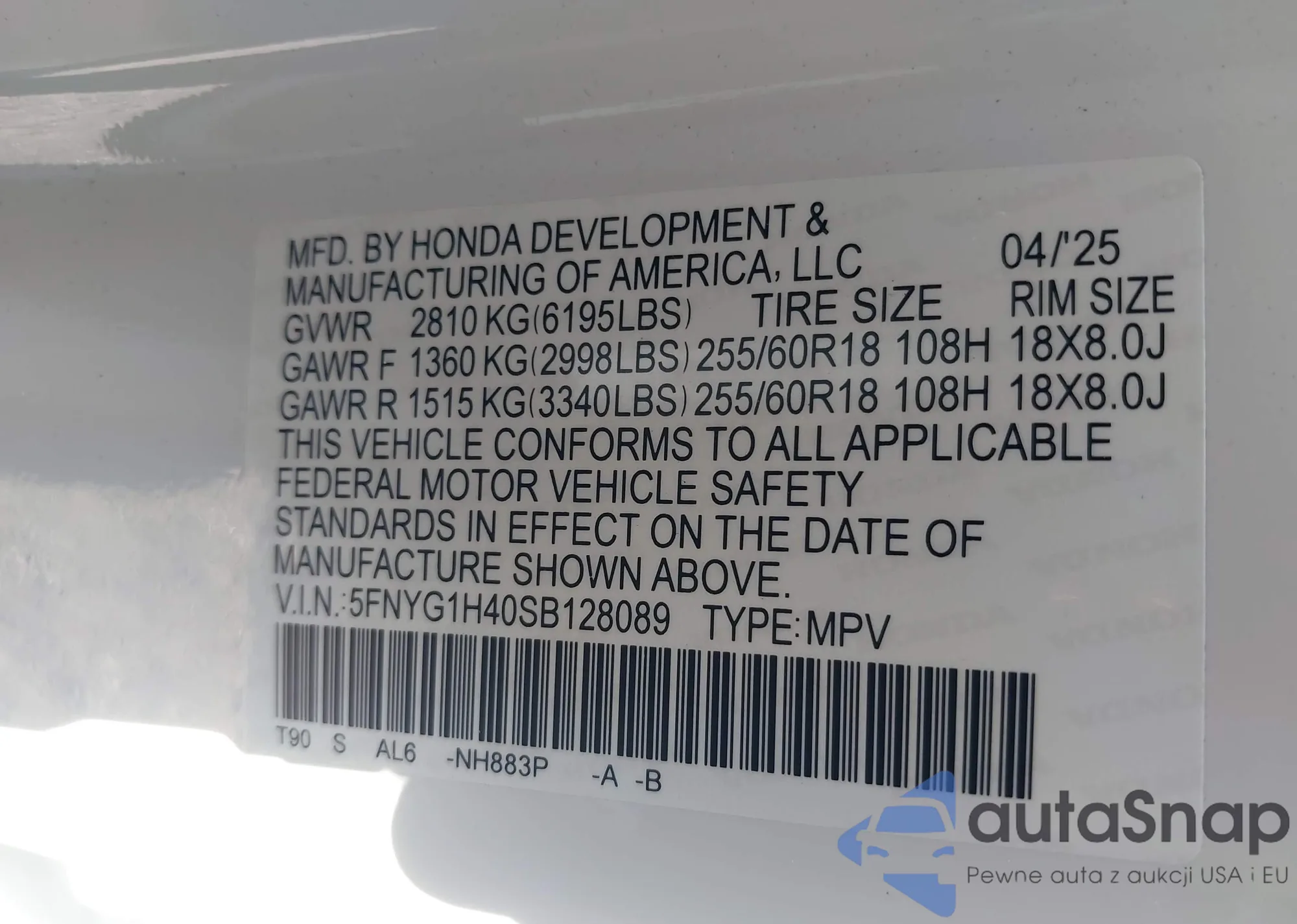 VIN: 5FNYG1H40SB128089