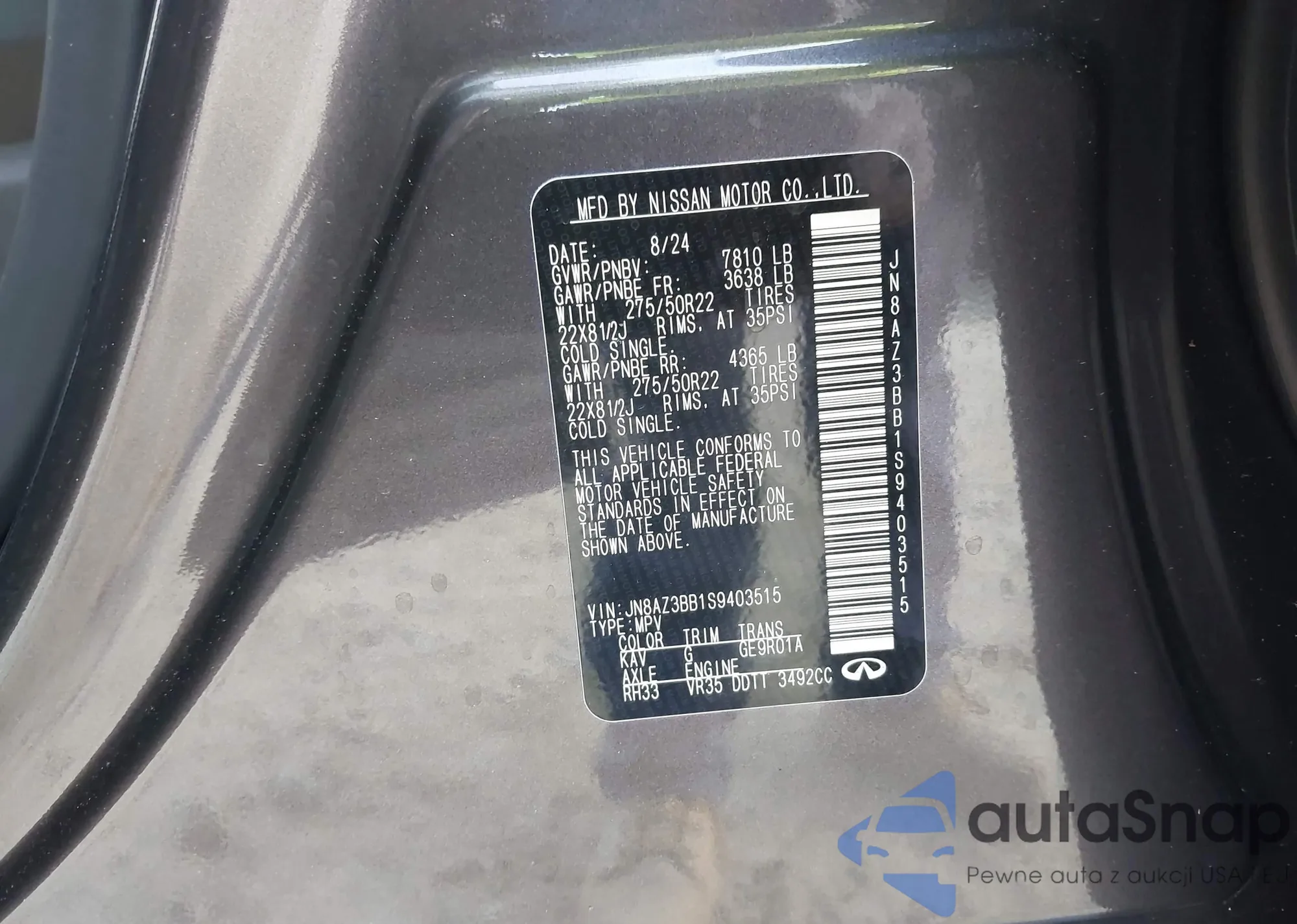 Samochód Infiniti QX80 2025 (VIN JN8AZ3BB1S9403515) nie był wcześniej licytowany. Dokumenty są czyste, przebieg odpowiada lub jest niższy niż średnia rynku. Sprzedaje go firma ubezpieczeniowa – polecamy zakup. Dostawa do portu zajmie ok. 6–8 tygodni.