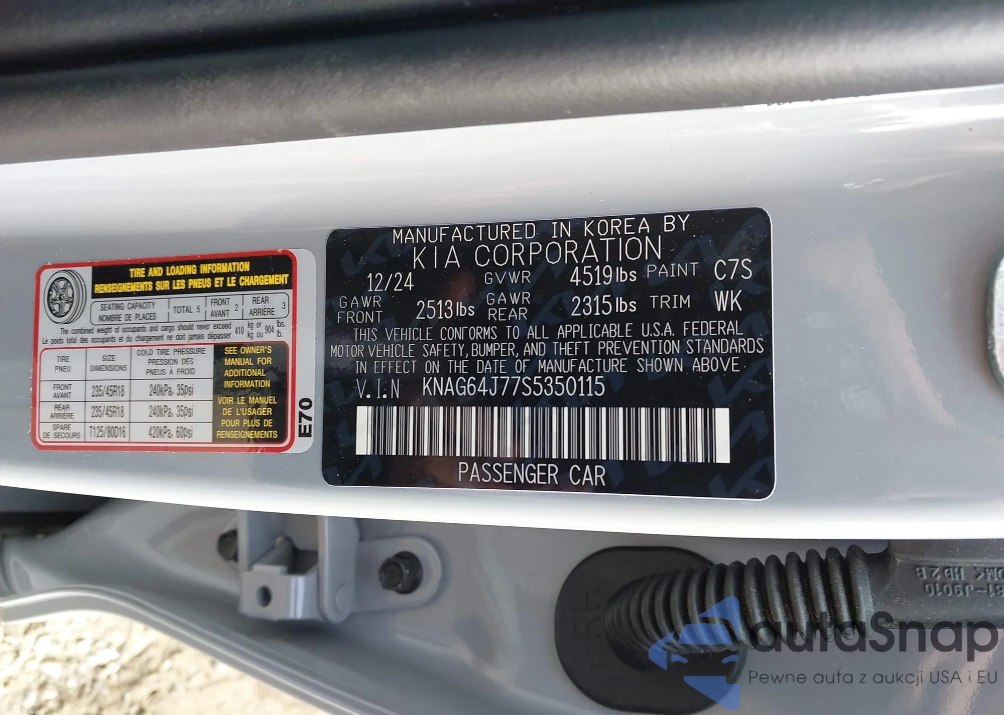 Samochód Kia K5 2025 (VIN KNAG64J77S5350115) nie był wcześniej licytowany. Dokumenty są czyste, przebieg odpowiada lub jest niższy niż średnia rynku. Sprzedaje go firma ubezpieczeniowa – polecamy zakup. Dostawa do portu zajmie ok. 6–8 tygodni.