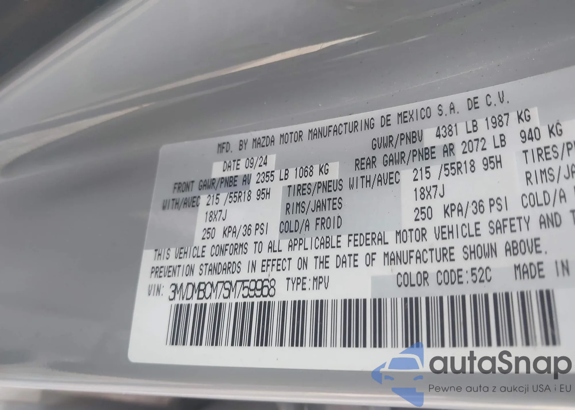Samochód Mazda CX-30 2025 (VIN 3MVDMBCM7SM759968) nie był wcześniej licytowany. Dokumenty są czyste, przebieg odpowiada lub jest niższy niż średnia rynku. Sprzedaje go firma ubezpieczeniowa – polecamy zakup. Dostawa do portu zajmie ok. 6–8 tygodni.