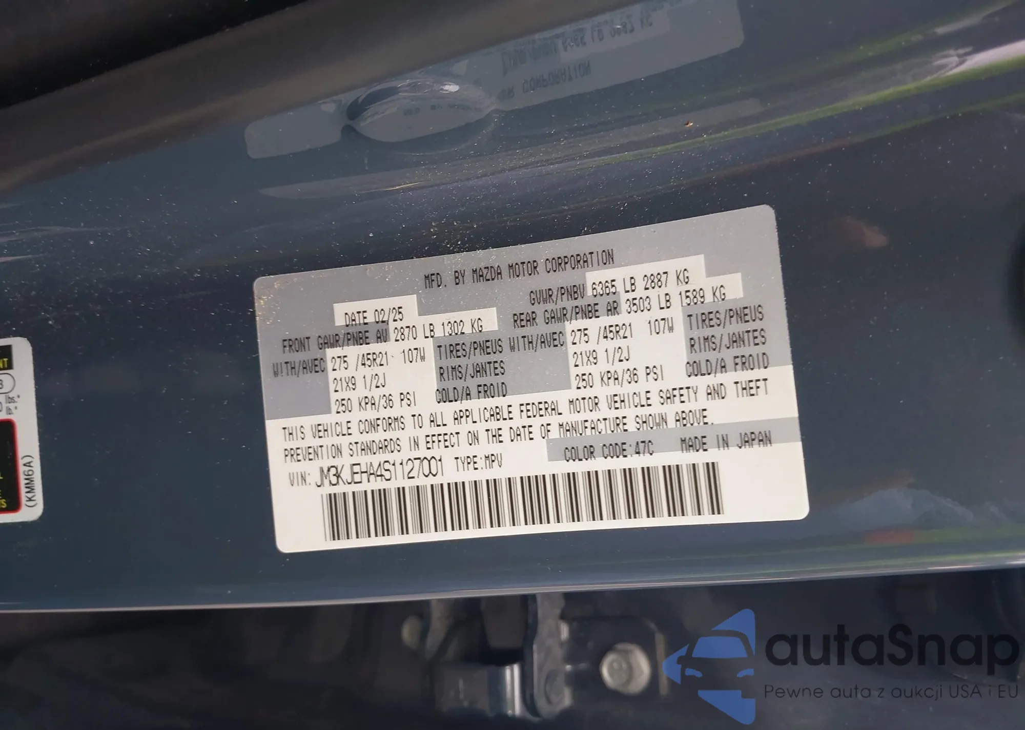 Samochód Mazda CX-70 2025 (VIN JM3KJEHA4S1127001) nie był wcześniej licytowany. Dokumenty są czyste, przebieg odpowiada lub jest niższy niż średnia rynku. Sprzedaje go firma ubezpieczeniowa – polecamy zakup. Dostawa do portu zajmie ok. 6–8 tygodni.