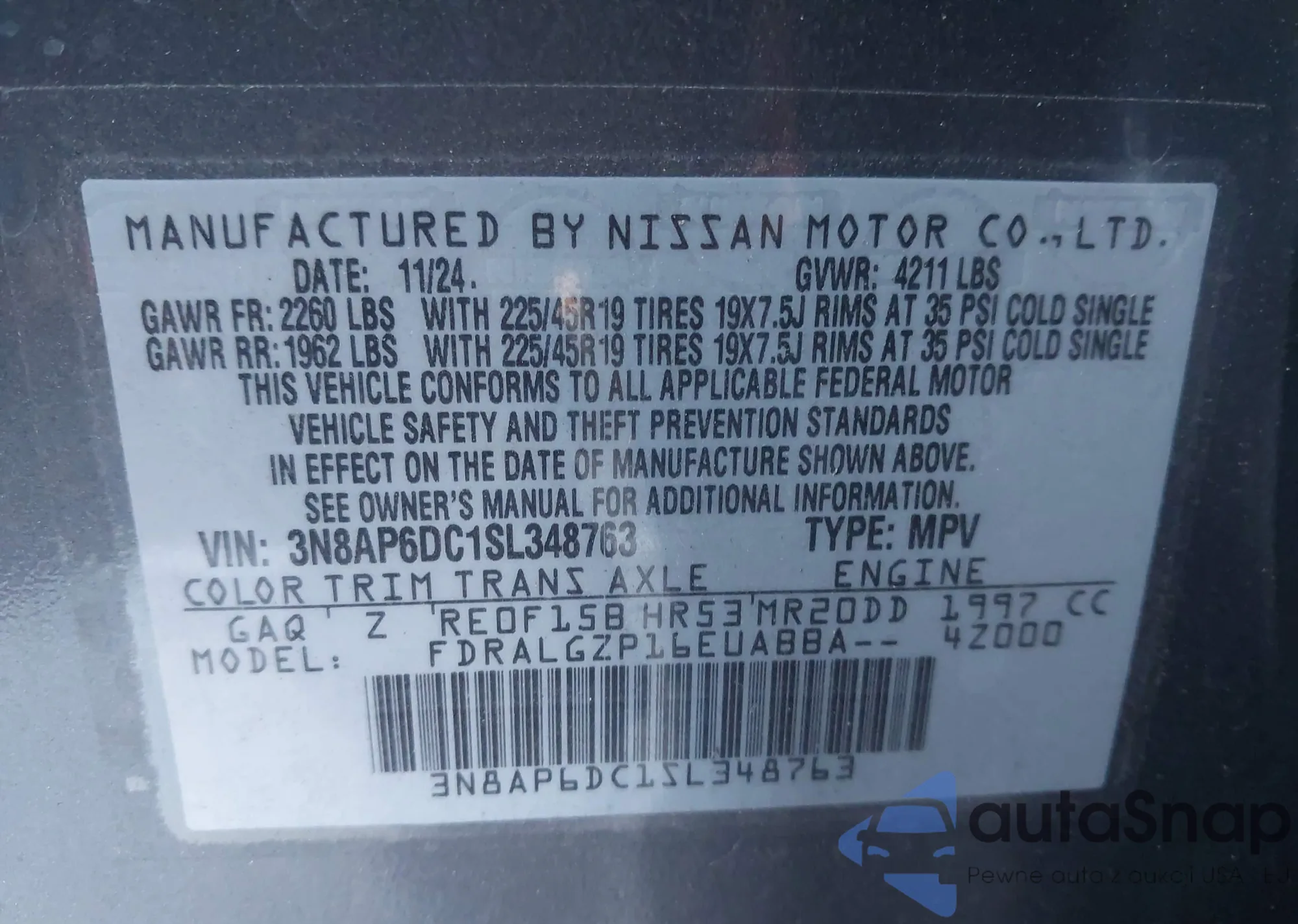 • VIN: 3N8AP6DC1SL348763