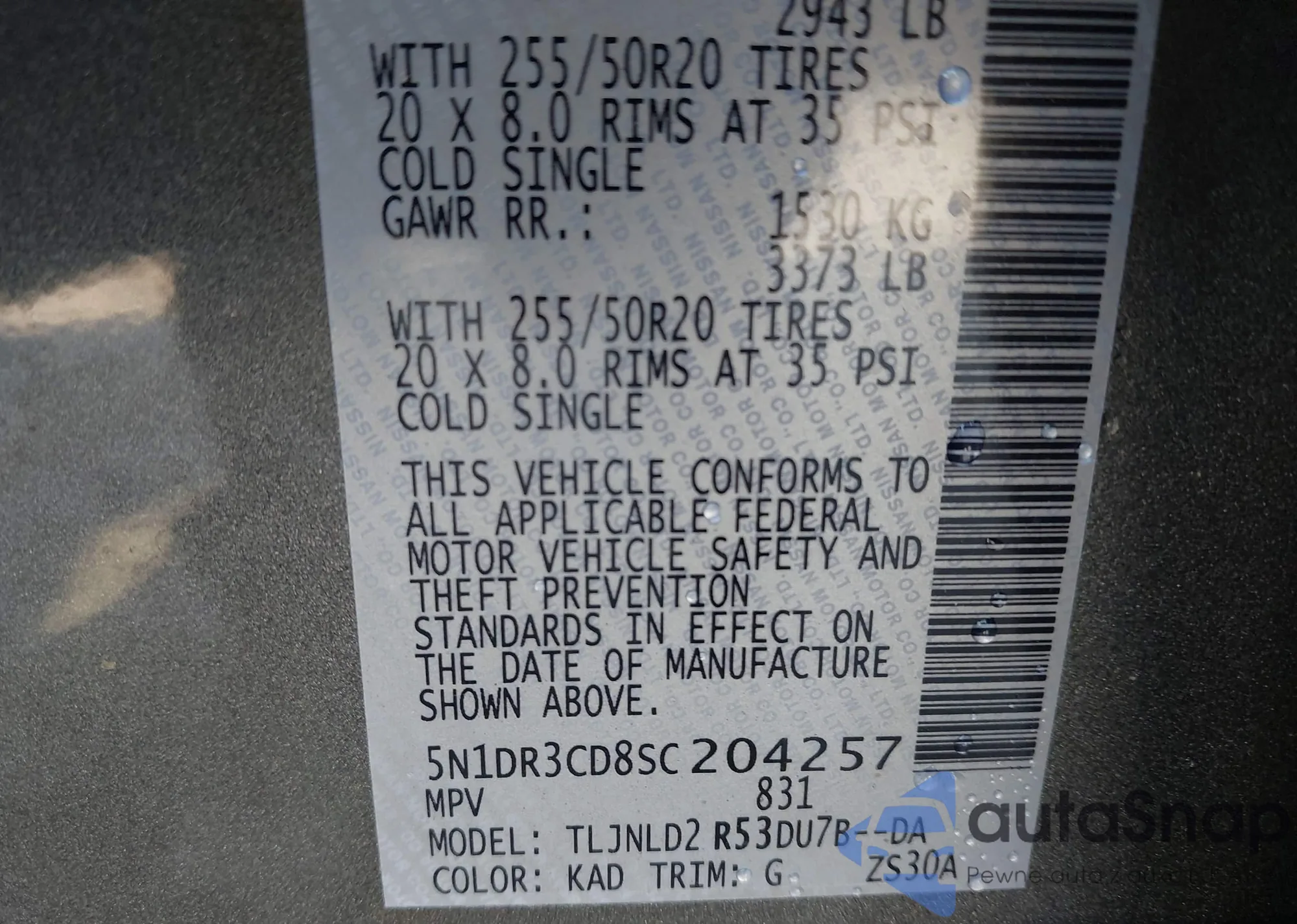 VIN: 5N1DR3CD8SC204257