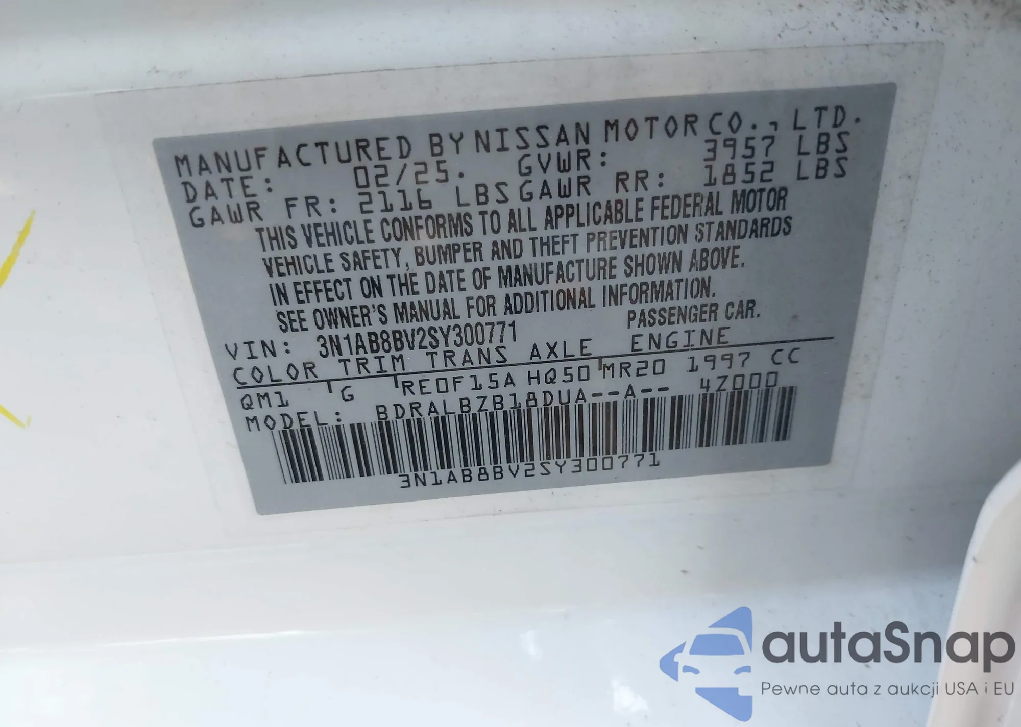 VIN: 3N1AB8BV2SY300771