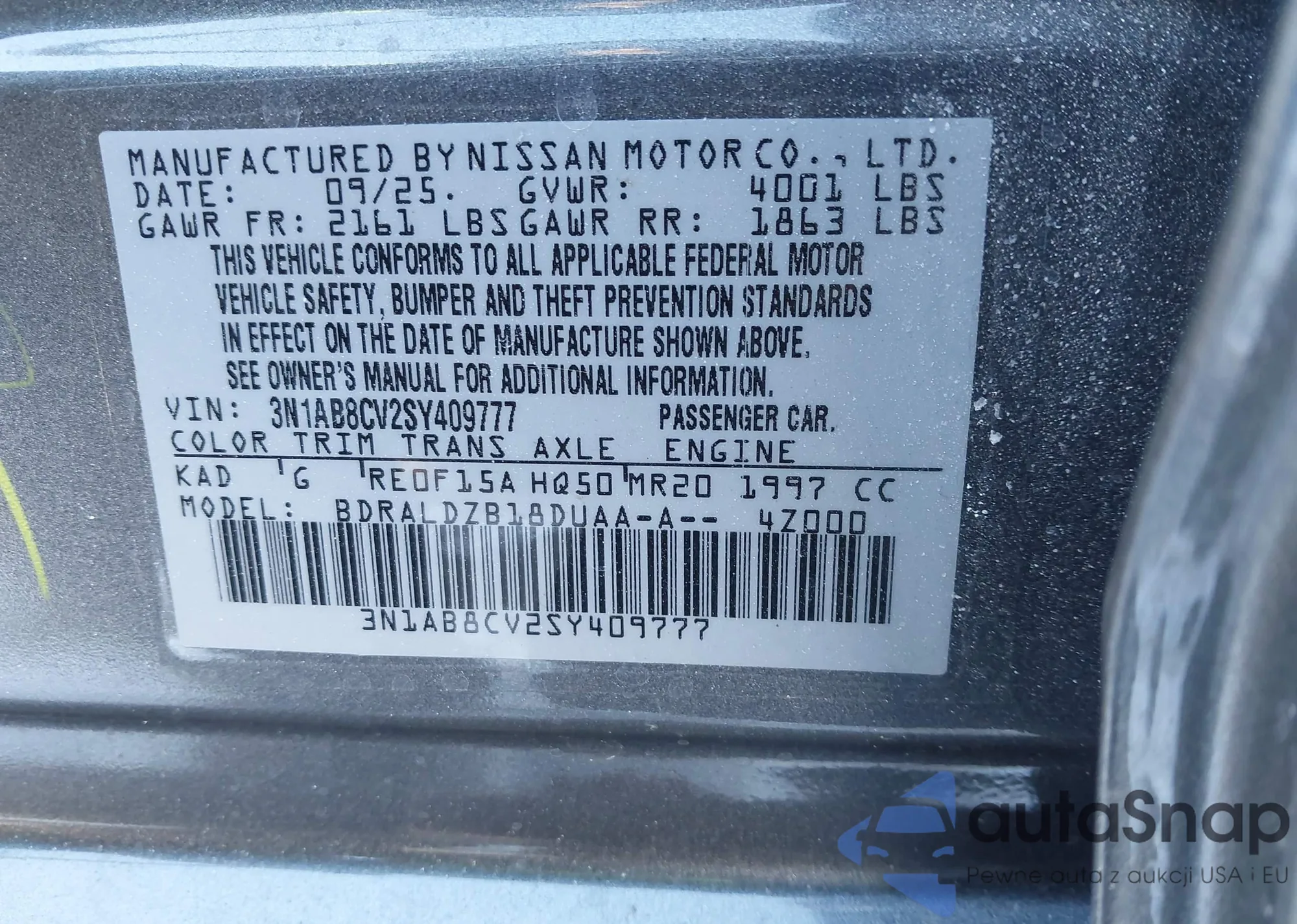 Samochód Nissan Sentra 2025 (VIN 3N1AB8CV2SY409777) nie był wcześniej licytowany. Dokumenty są czyste, przebieg odpowiada lub jest niższy niż średnia rynku. Sprzedaje go firma ubezpieczeniowa – polecamy zakup. Dostawa do portu zajmie ok. 6–8 tygodni.