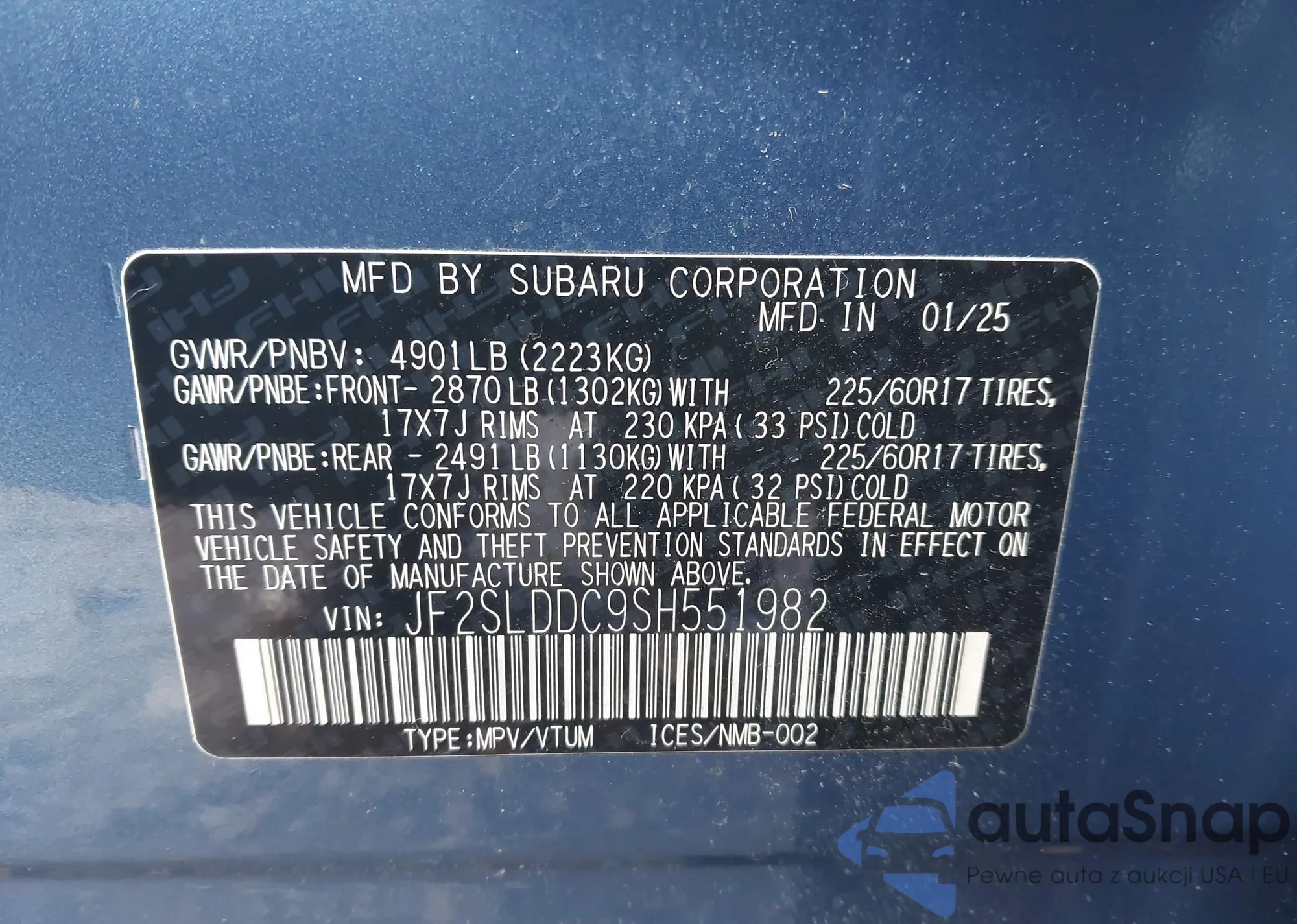 Samochód Subaru Forester 2025 (VIN JF2SLDDC9SH551982) nie był wcześniej licytowany. Dokumenty są czyste, przebieg odpowiada lub jest niższy niż średnia rynku. Sprzedaje go firma ubezpieczeniowa – polecamy zakup. Dostawa do portu zajmie ok. 6–8 tygodni.