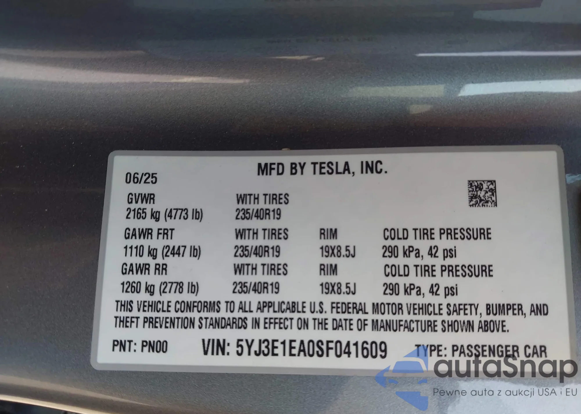 VIN: 5YJ3E1EA0SF041609