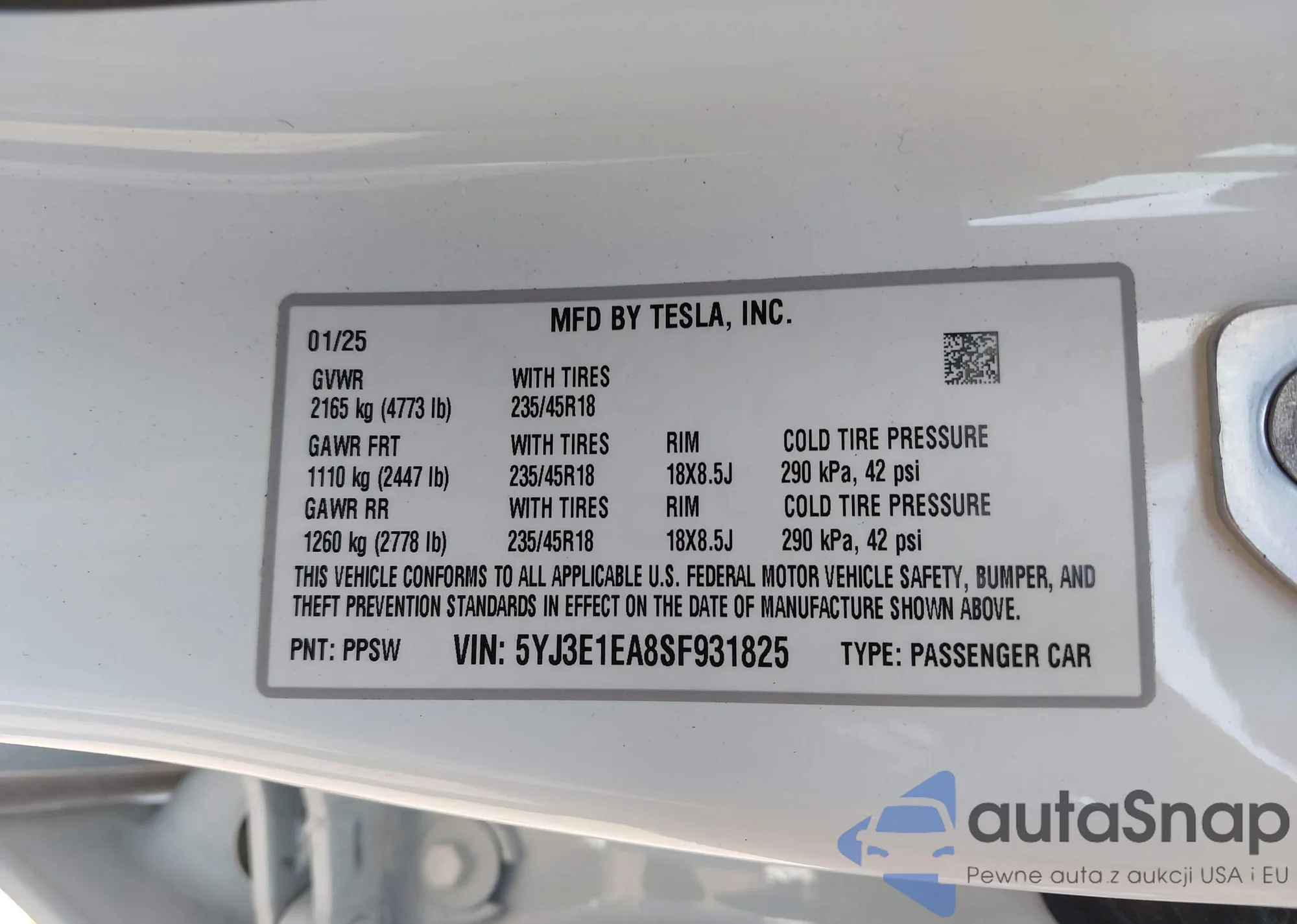 VIN: 5YJ3E1EA8SF931825