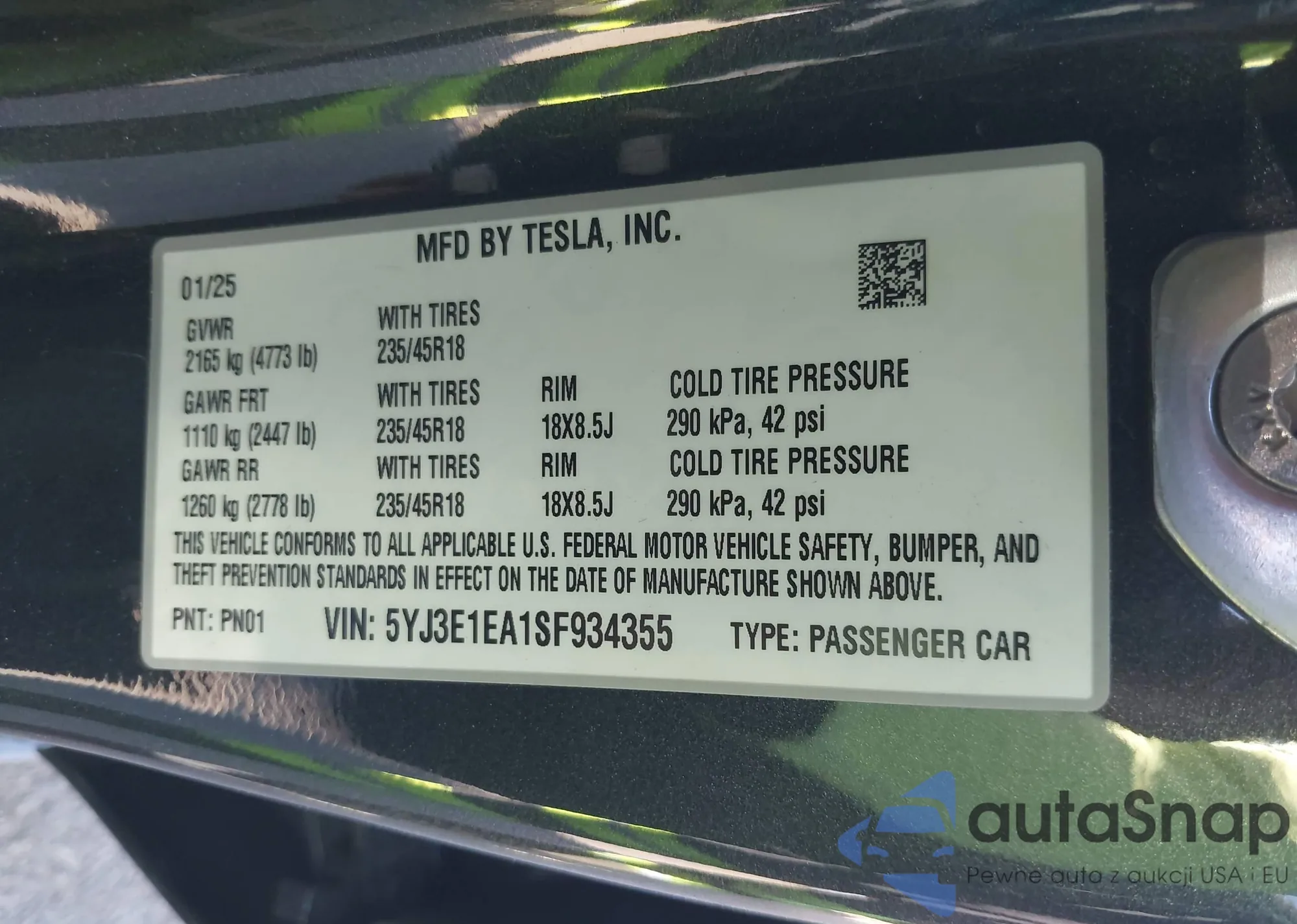 VIN: 5YJ3E1EA1SF934355