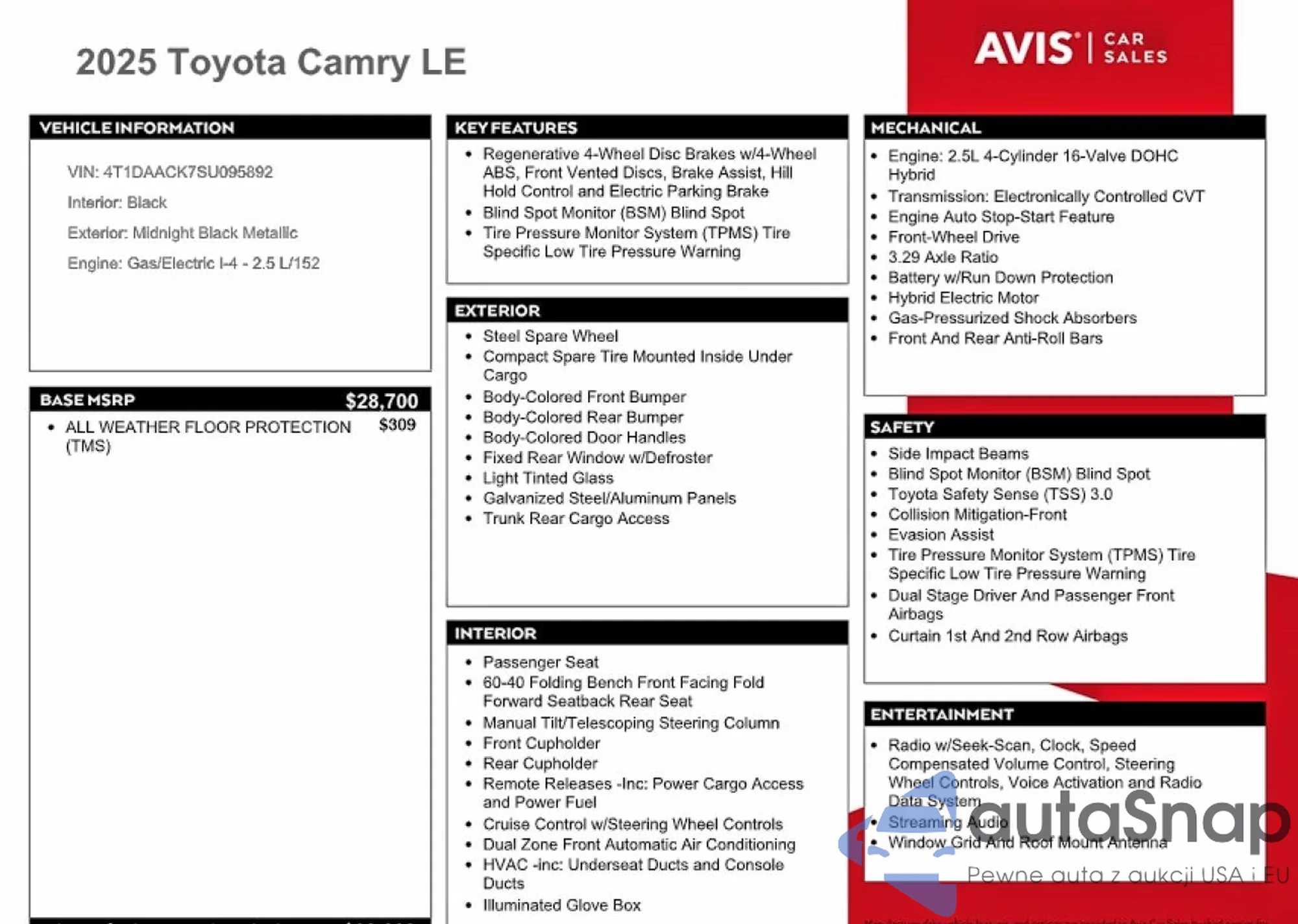 Samochód Toyota Camry 2025 (VIN 4T1DAACK7SU095892) ma dokumenty uniemożliwiające rejestrację. Mogą pojawić się trudności przy eksporcie i rejestracji. Skontaktuj się z ekspertami AutaSnap w celu znalezienia alternatywy.