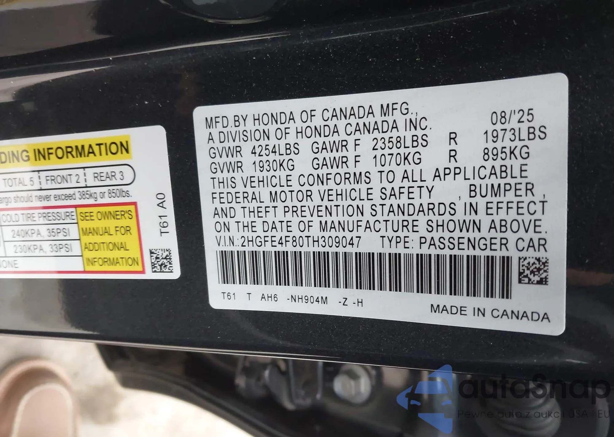 Samochód Honda Civic 2026 (VIN 2HGFE4F80TH309047) nie był wcześniej licytowany. Dokumenty są czyste, przebieg odpowiada lub jest niższy niż średnia rynku. Sprzedaje go firma ubezpieczeniowa – polecamy zakup. Dostawa do portu zajmie ok. 6–8 tygodni.