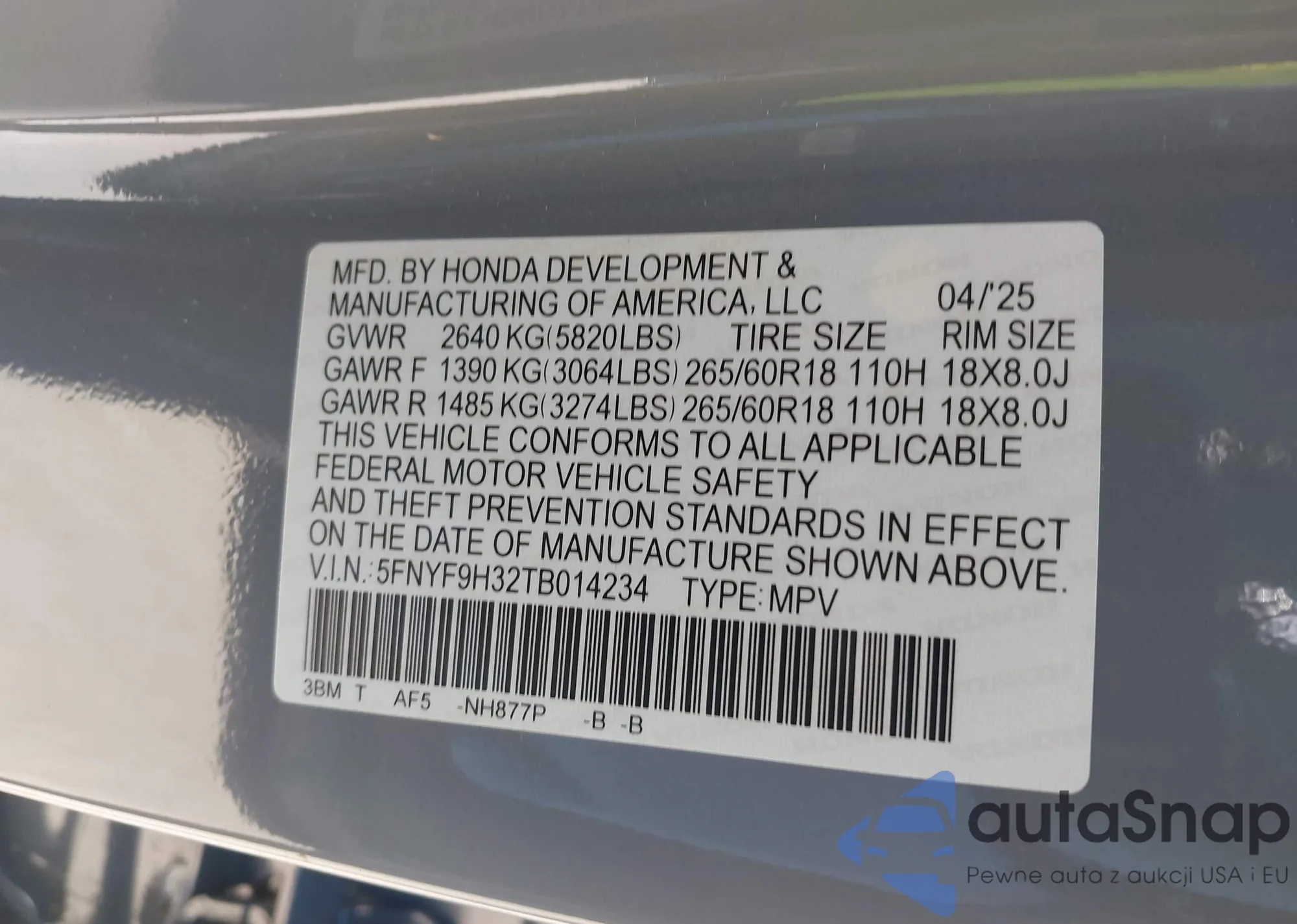 Samochód Honda Passport 2026 (VIN 5FNYF9H32TB014234) nie był wcześniej licytowany. Dokumenty są czyste, przebieg odpowiada lub jest niższy niż średnia rynku. Sprzedaje go firma ubezpieczeniowa – polecamy zakup. Dostawa do portu zajmie ok. 6–8 tygodni.