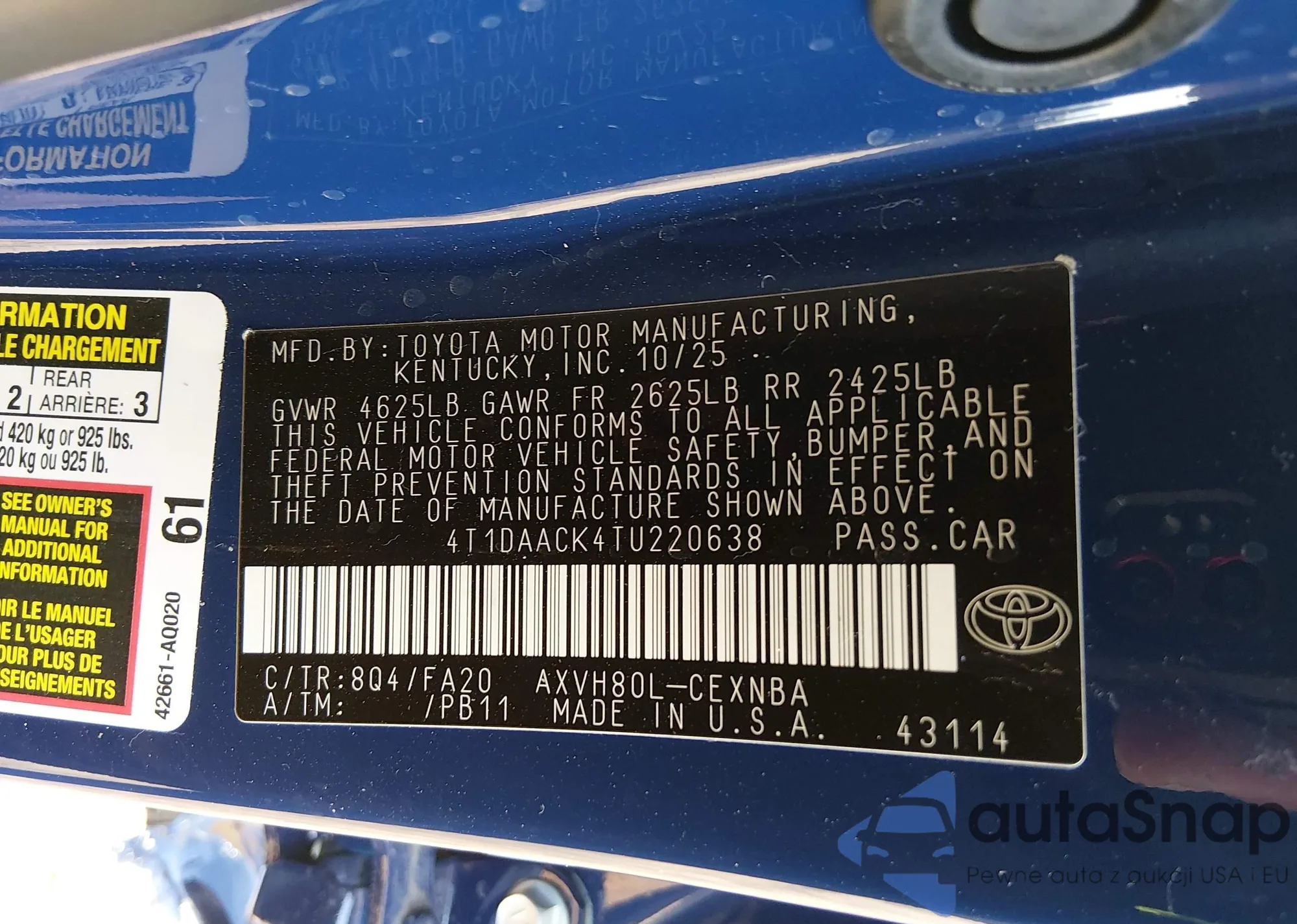 Samochód Toyota Camry 2026 (VIN 4T1DAACK4TU220638) nie był wcześniej licytowany. Dokumenty są czyste, przebieg odpowiada lub jest niższy niż średnia rynku. Sprzedaje go firma ubezpieczeniowa – polecamy zakup. Dostawa do portu zajmie ok. 6–8 tygodni.