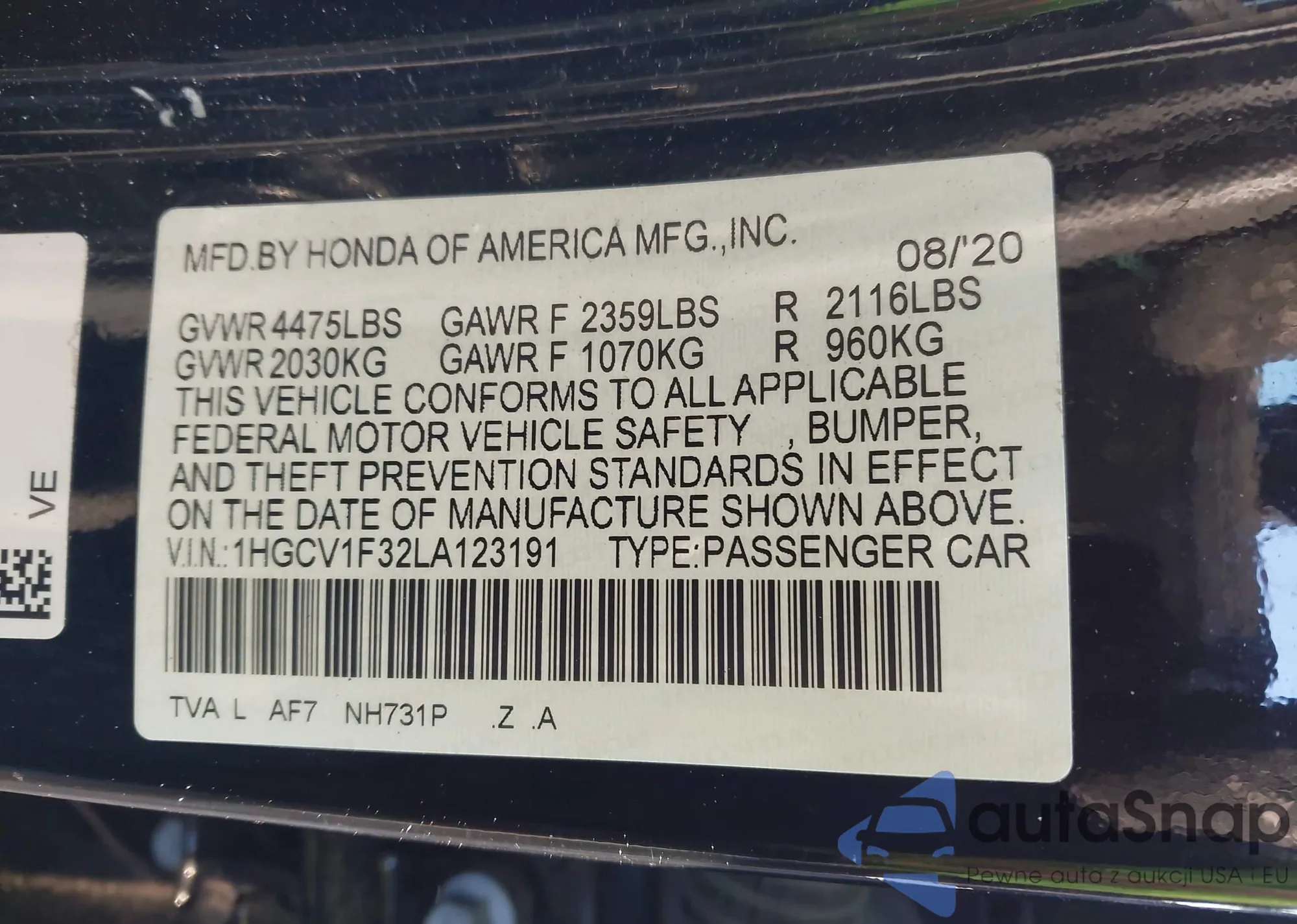 LOT: 43959042 VIN: 1HGCV1F32LA123191