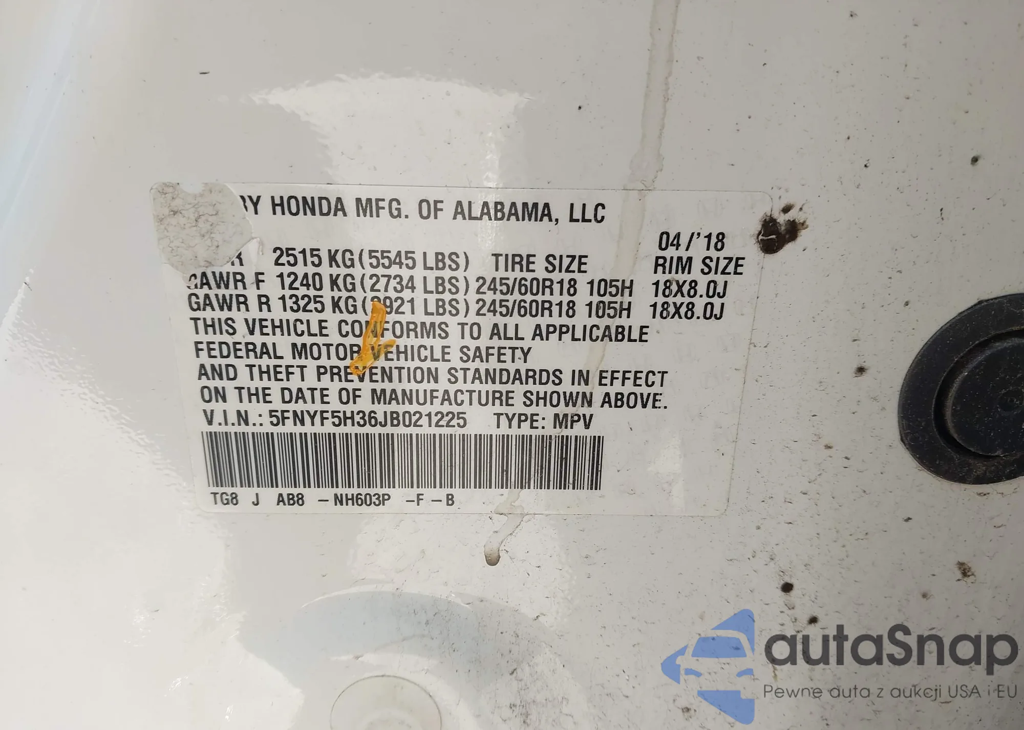 • VIN 5FNYF5H36JB021225