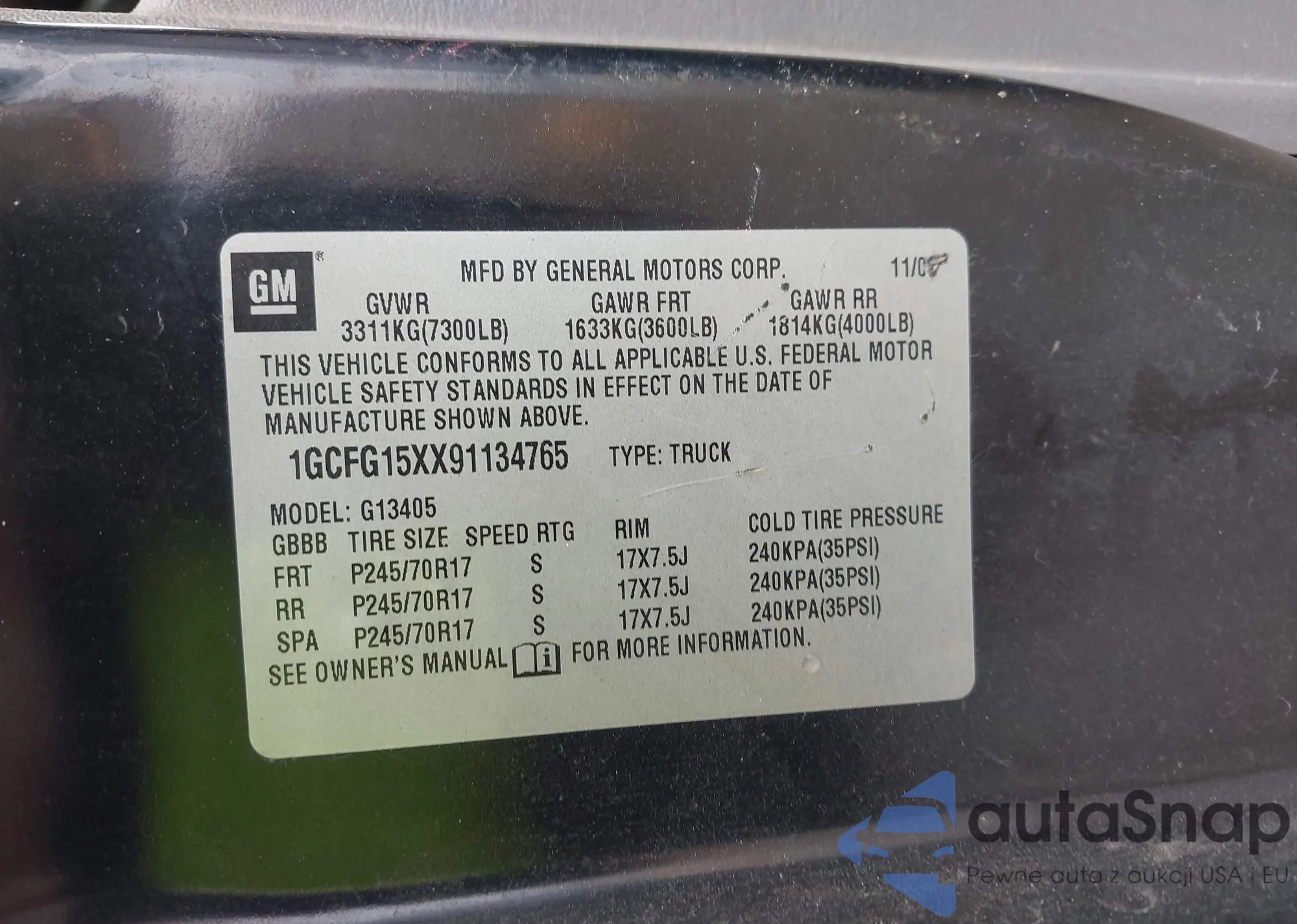 LOT: 42508465 VIN: 1GCFG15XX91134765 Uszkodzenia: