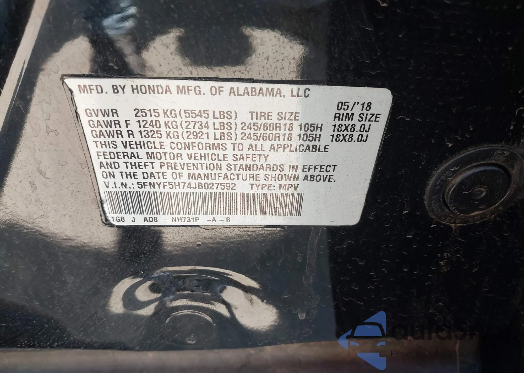- VIN 5FNYF5H74JB027592