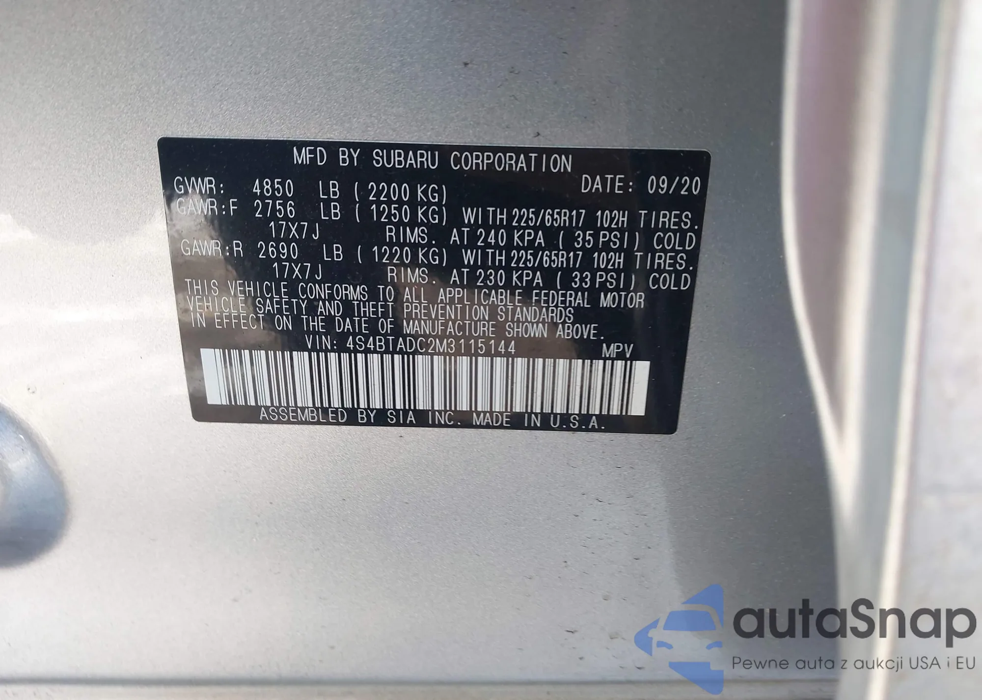 2021 Subaru Outback Premium z USA, uszkodzony, nr VIN 4S4BTADC2M3115144