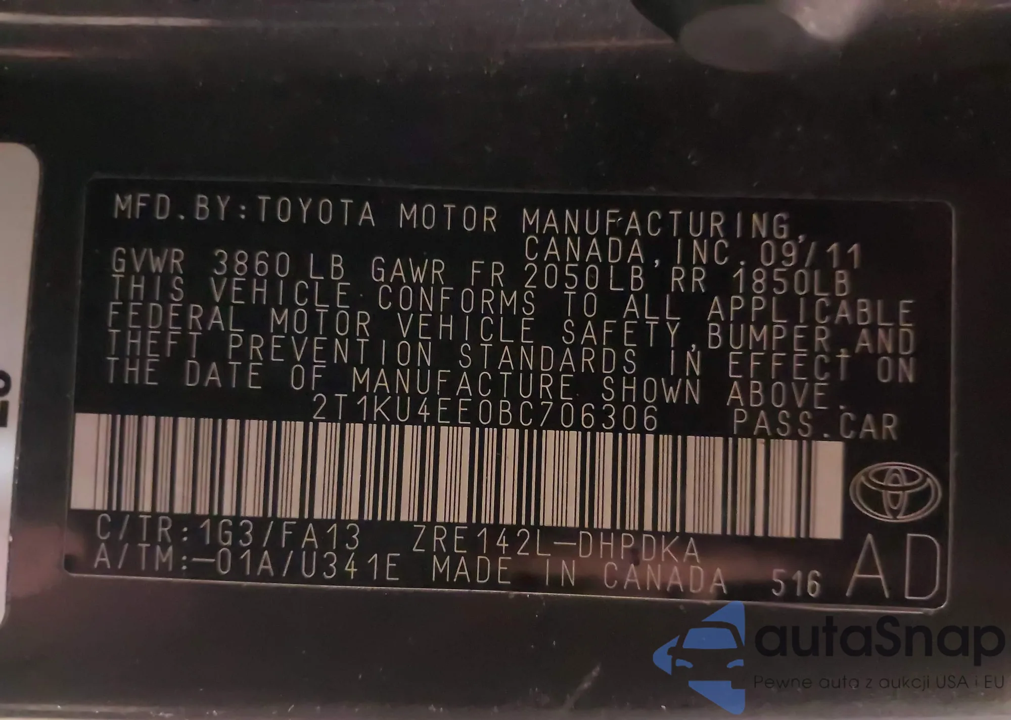 • VIN 2T1KU4EE0BC706306