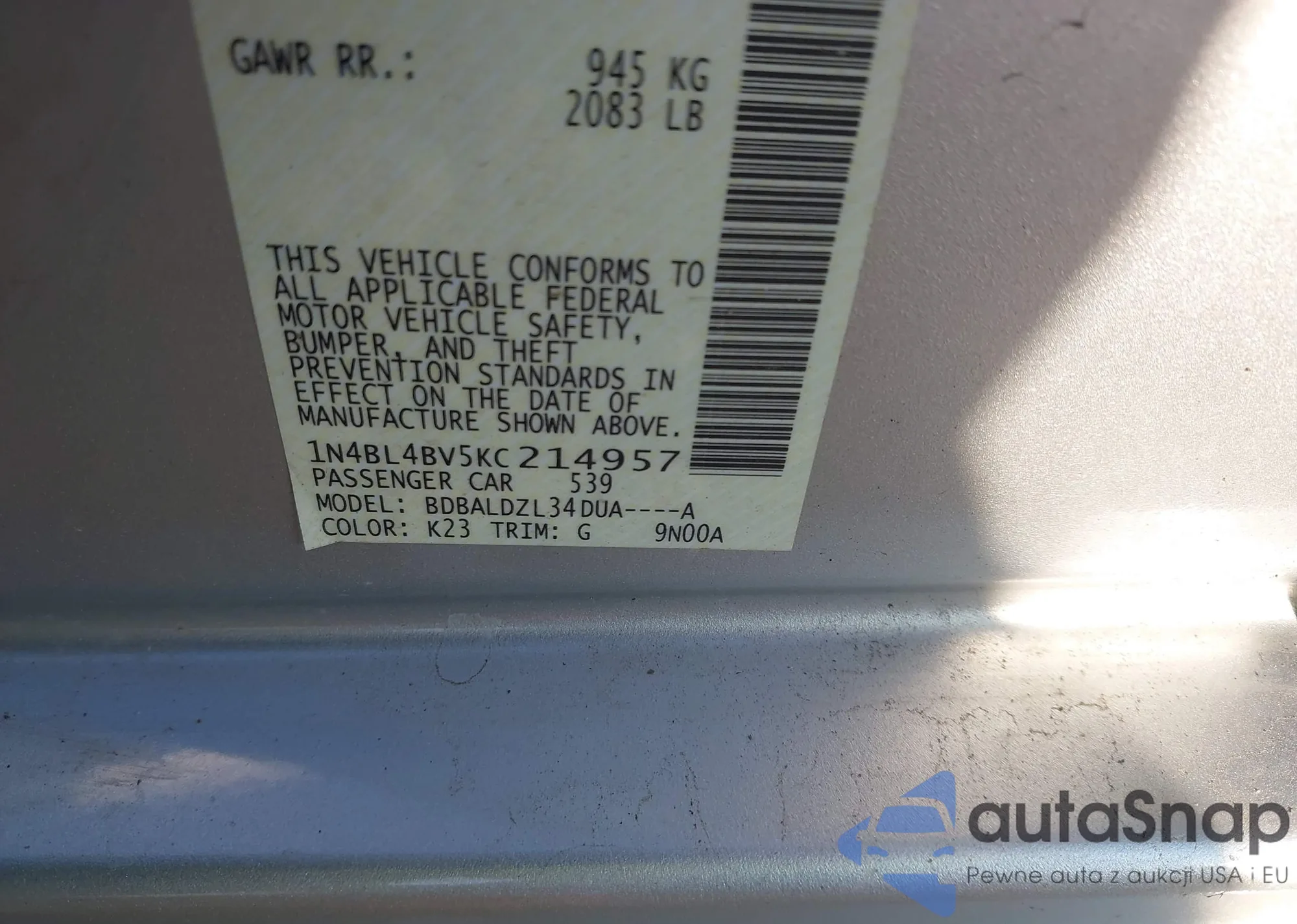 • VIN 1N4BL4BV5KC214957