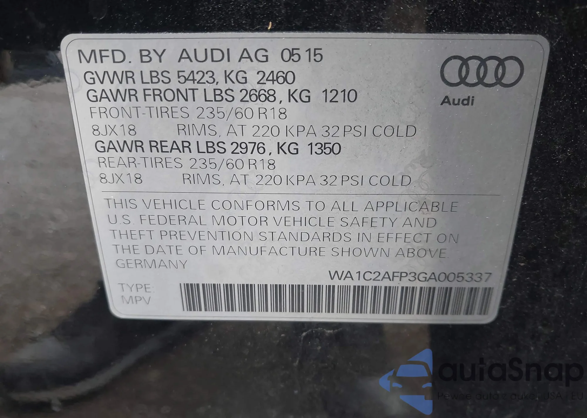 LOT: 43029693 VIN: WA1C2AFP3GA005337