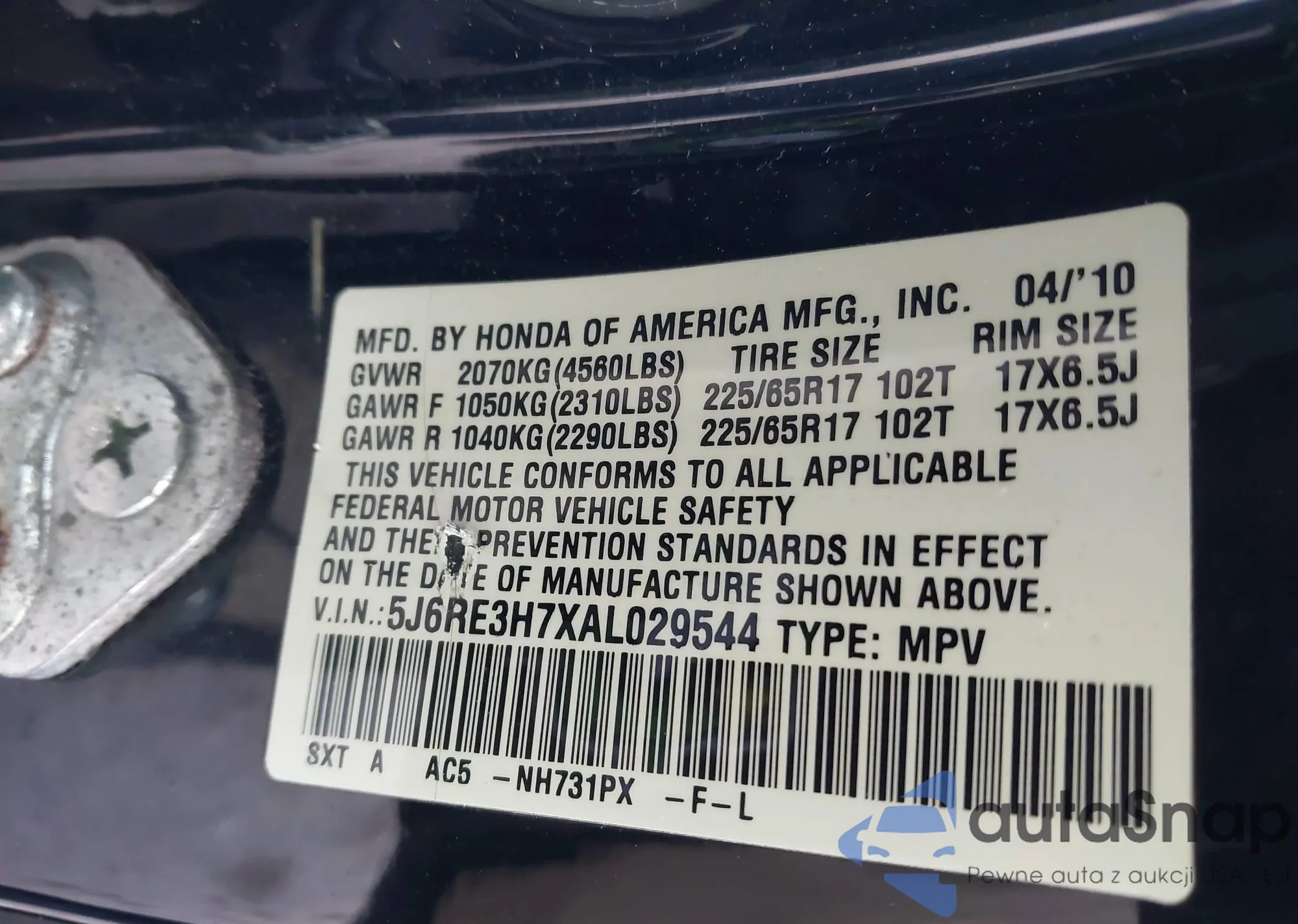 • VIN 5J6RE3H7XAL029544