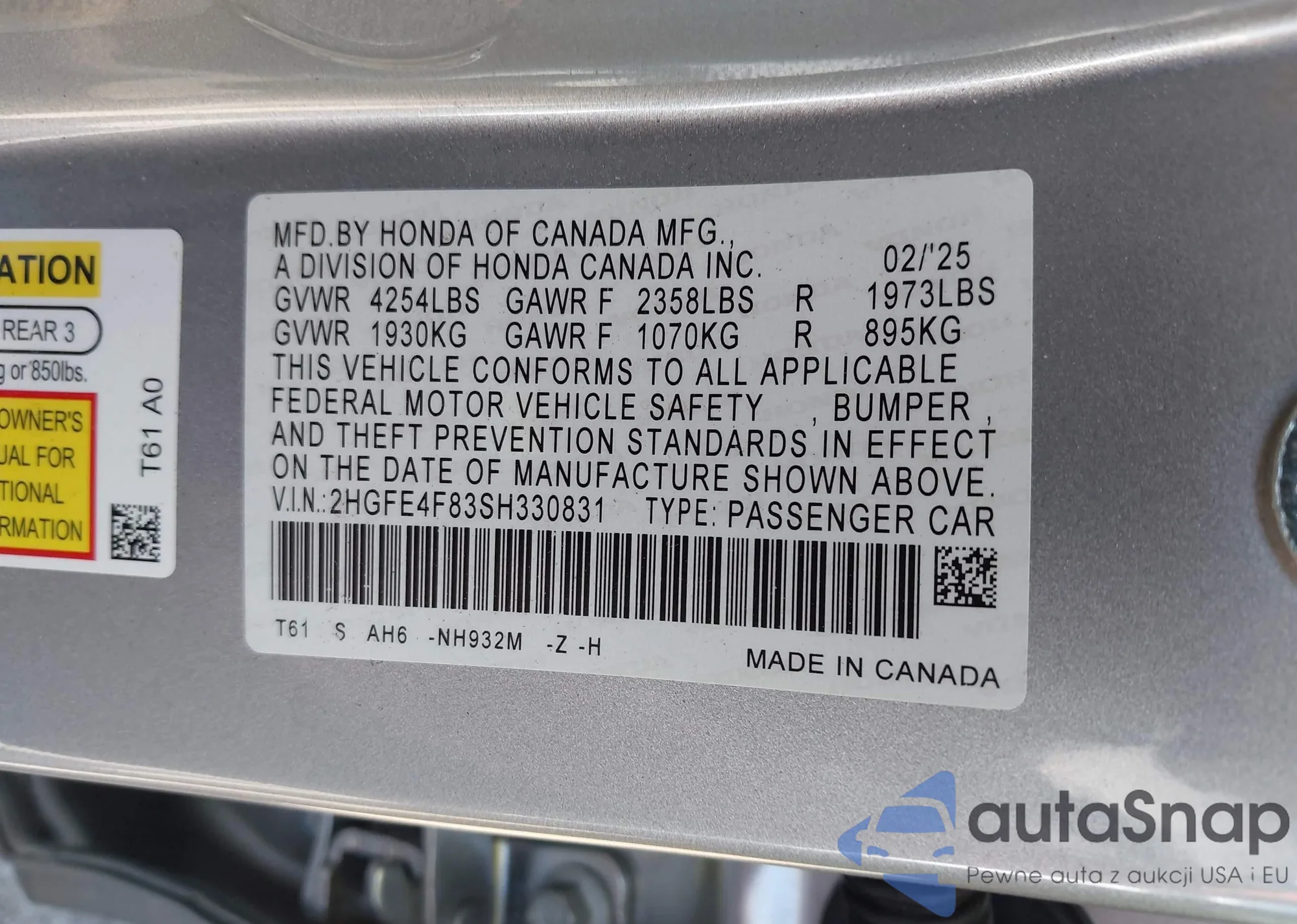 LOT: 83852275 VIN: JHMGE87449S025183
