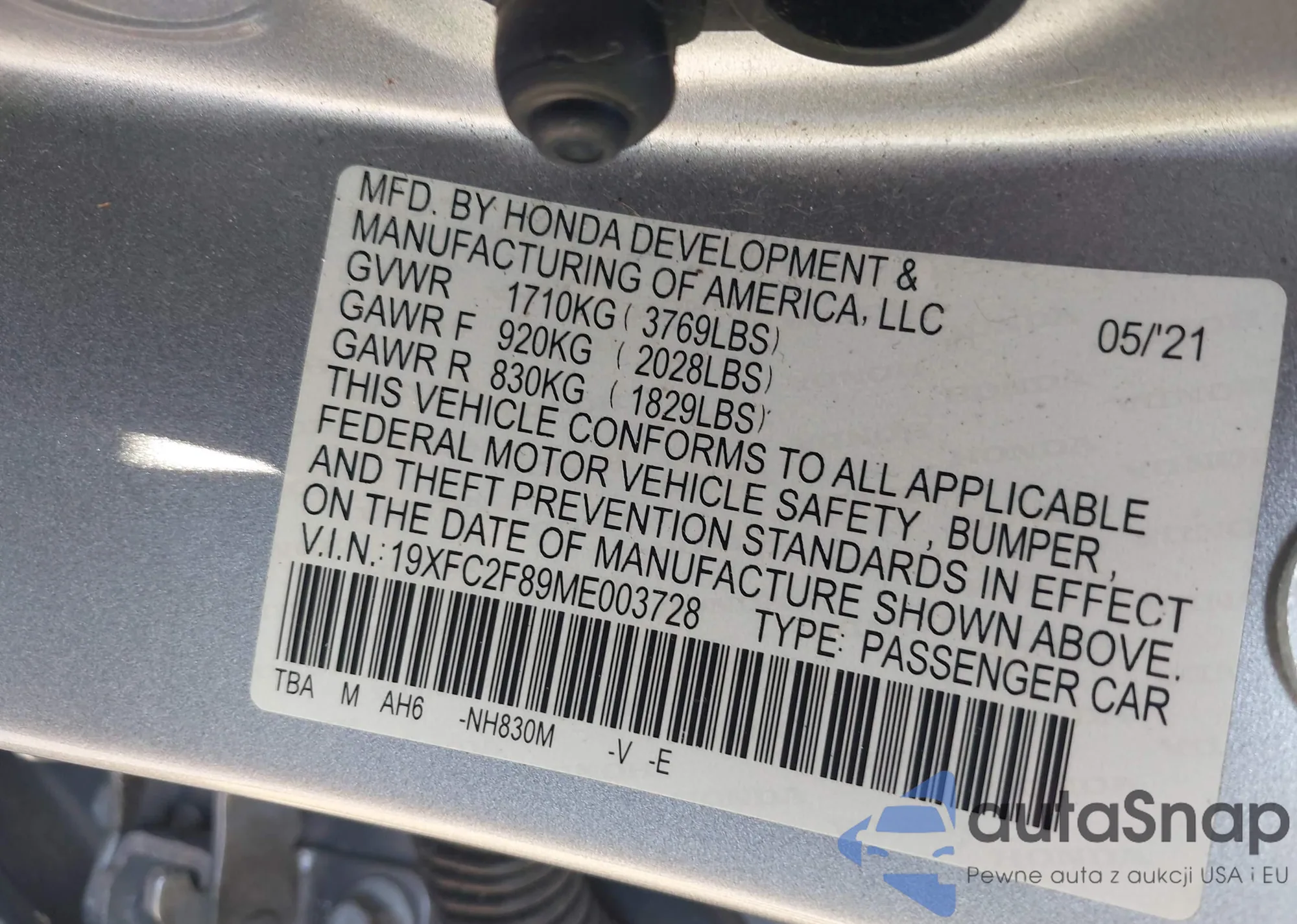 • VIN 19XFC2F89ME003728