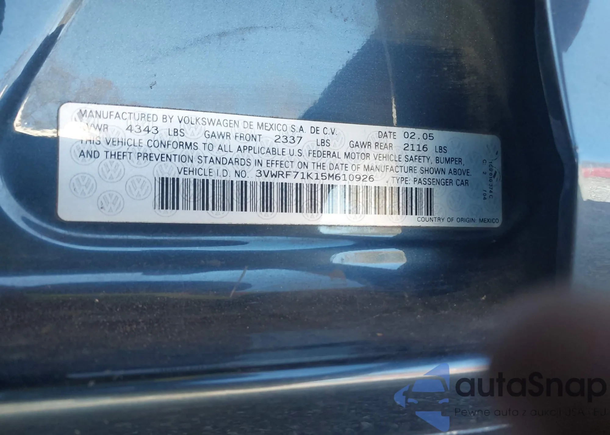 • VIN 3VWRF71K15M610926