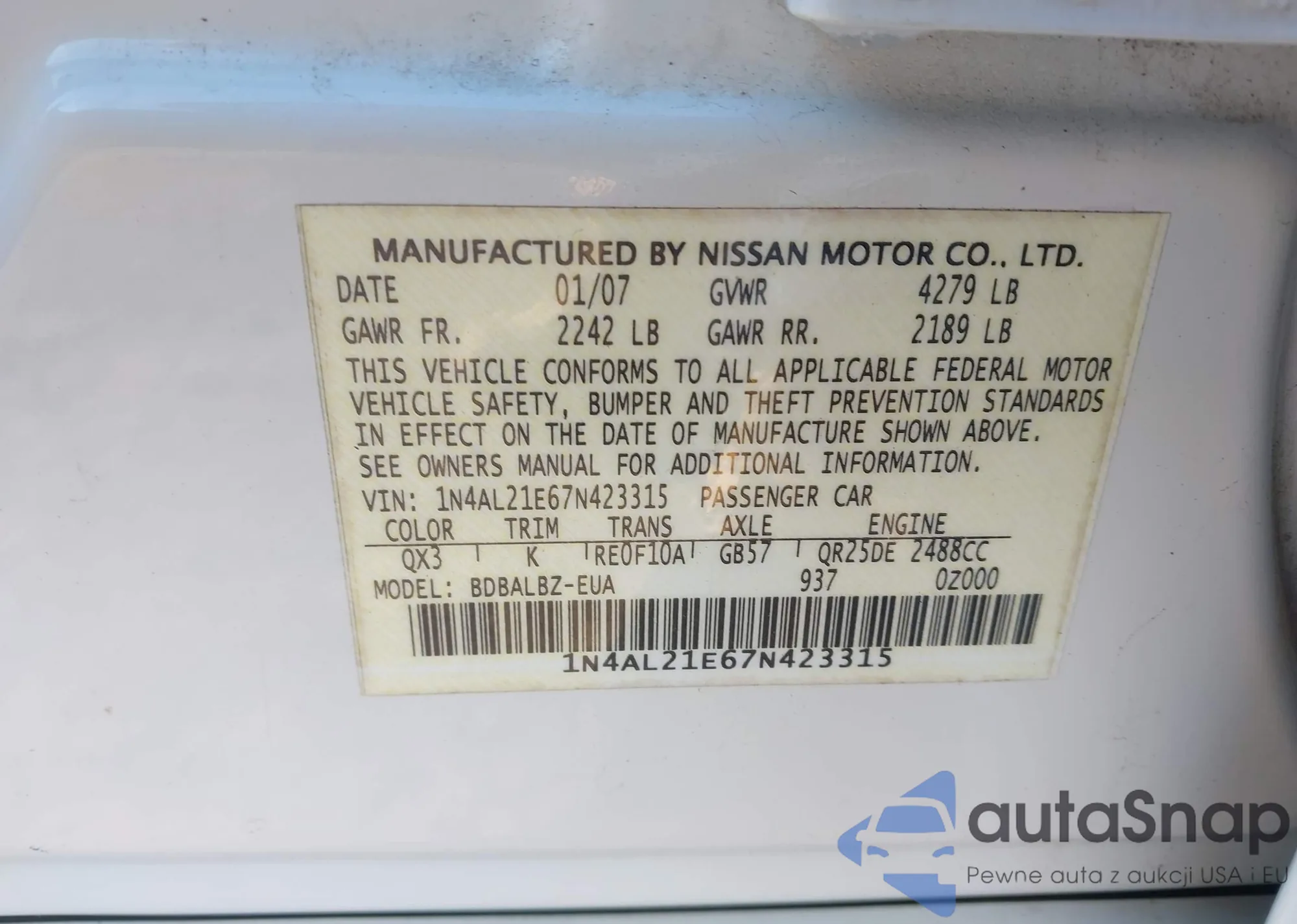 • VIN 1N4AL21E67N423315